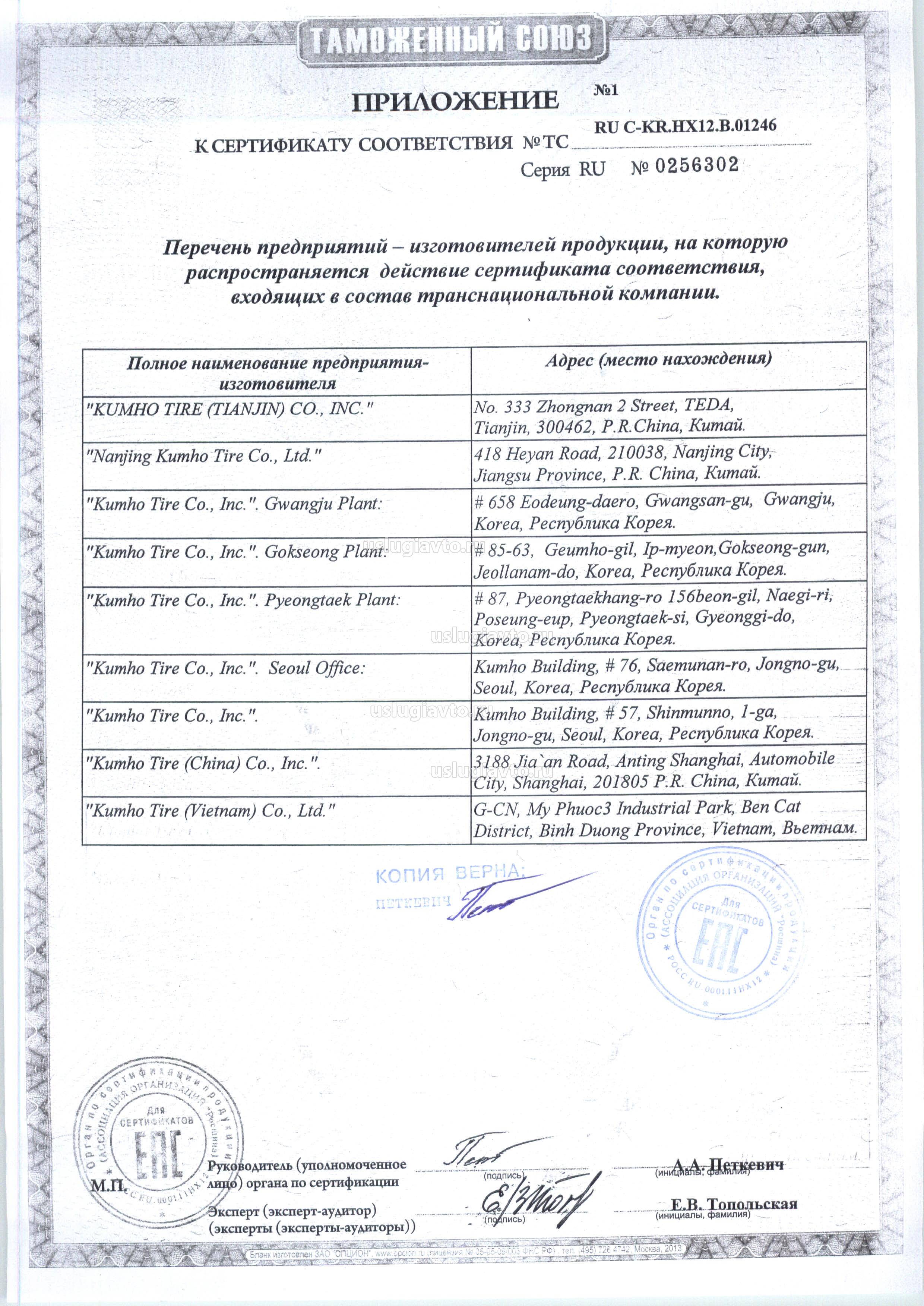 «Kumho Tire Со., Inc.» (см. приложение № 0256302). Юридический и фактический адрес: (Head Office) Gwangju Plant, #658, Eodeung-daero, Gwangsan-gu, Gwangju, Korea, Республика Корея. Тел.: 02 6303-8517, факс: 02 6303 8598.