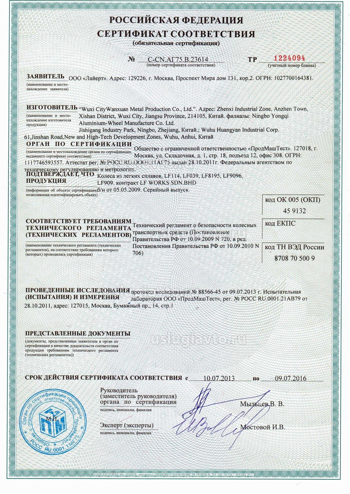 Сертификат № С-СN.АГ75.В.23614 на продукцию "Колеса из легких сплавов, изгот овителя “Wuxi CityWanxuan Metal Production Co., Ltd.”", серийный выпуск.