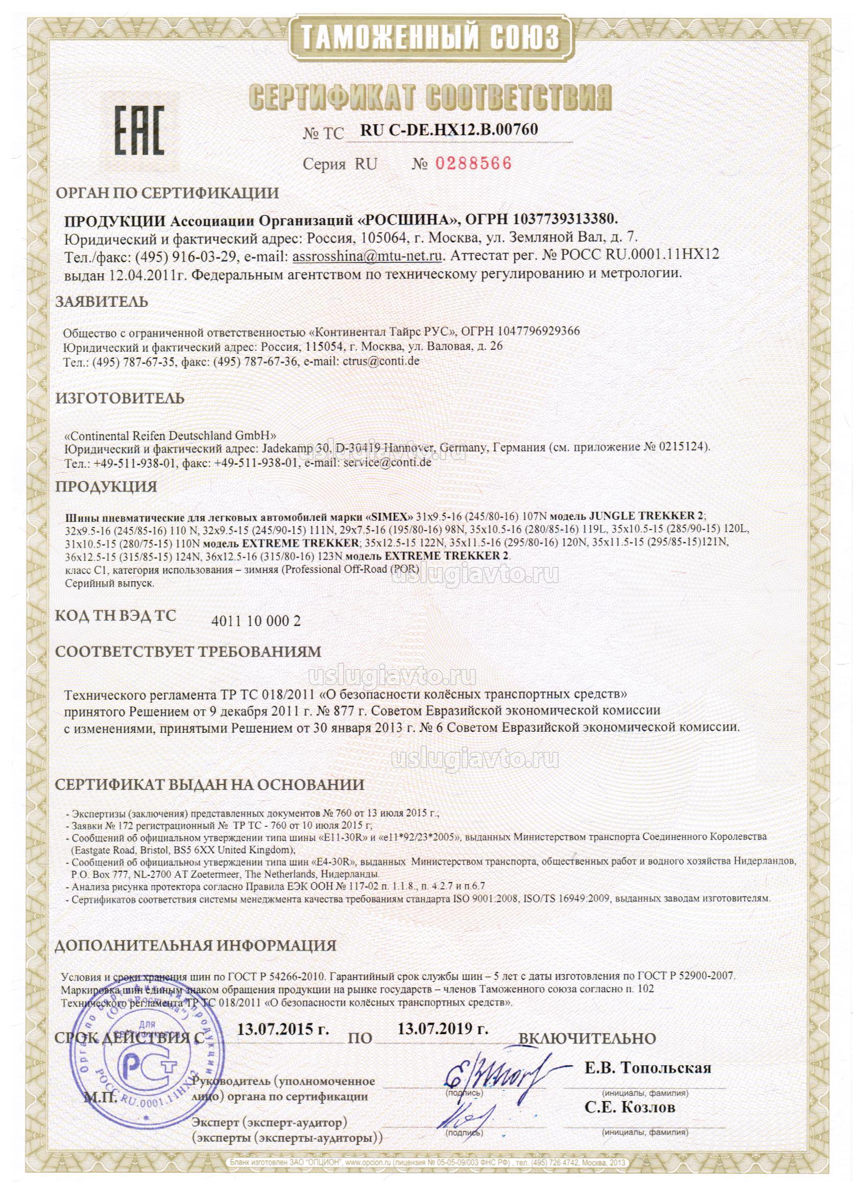 Шины пневматические для легковых автомобилей марки «SIMEX» 31x9.5-16 (245/80-16) 107N модель JUNGLE TREKKER 2: 32x9.5-16 (245/85-16) 110 N, 32x9.5-15 (245/90-15) 111N, 29x7.5-16 (195/80-16) 98N, 35x10.5-16 (280/85-16) 119L 35x10.5-15 (285/90-15) 120L, 31x10.5-15 (280/75-15) 110N модель EXTREME TREKKER; 35x12.5-15 122N, 35x11.5-16 (295/80-16) 120N. 35x1 1.5-15 (295/85-15)121N. 36x12.5-15 (315/85-15) 124N. 36x12.5-16 (315/80-16) 123N модель EXTREME TREKKER 2 класс C1. категория использования - зимняя (Professional Off-Road (POR2)
