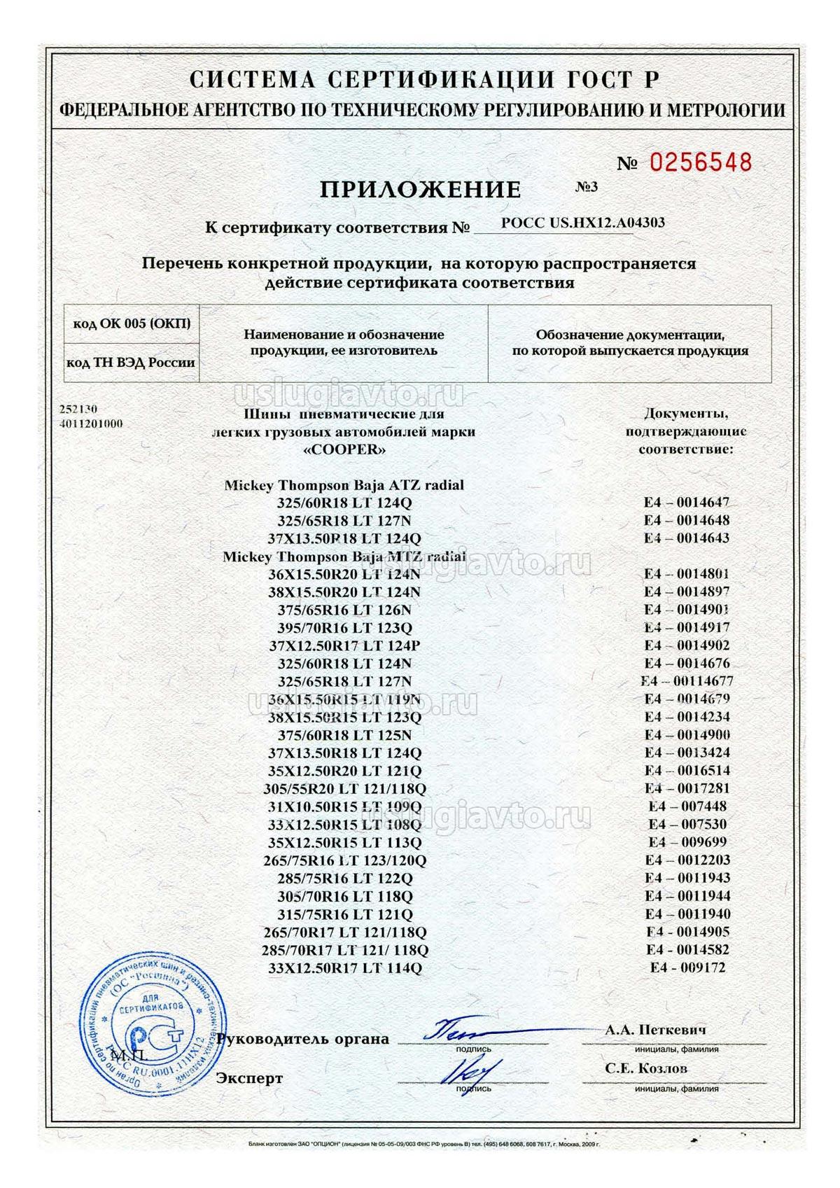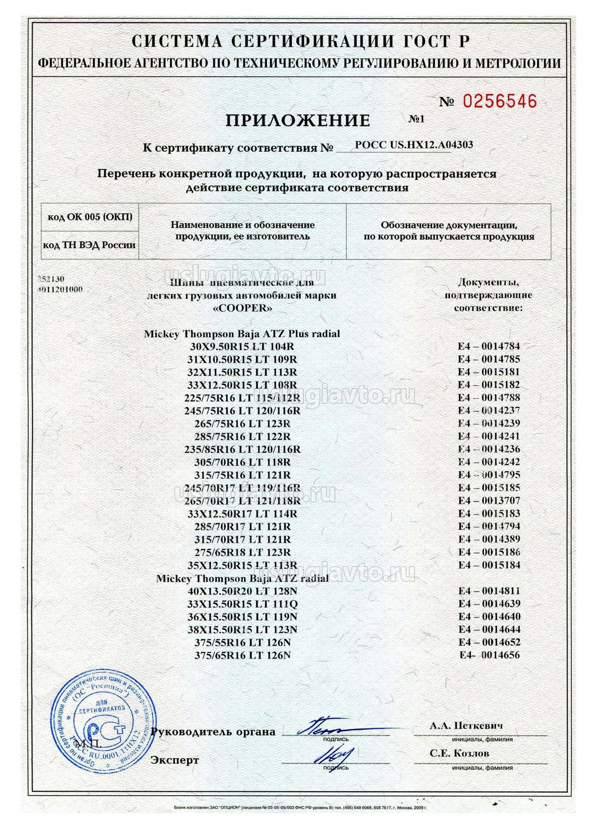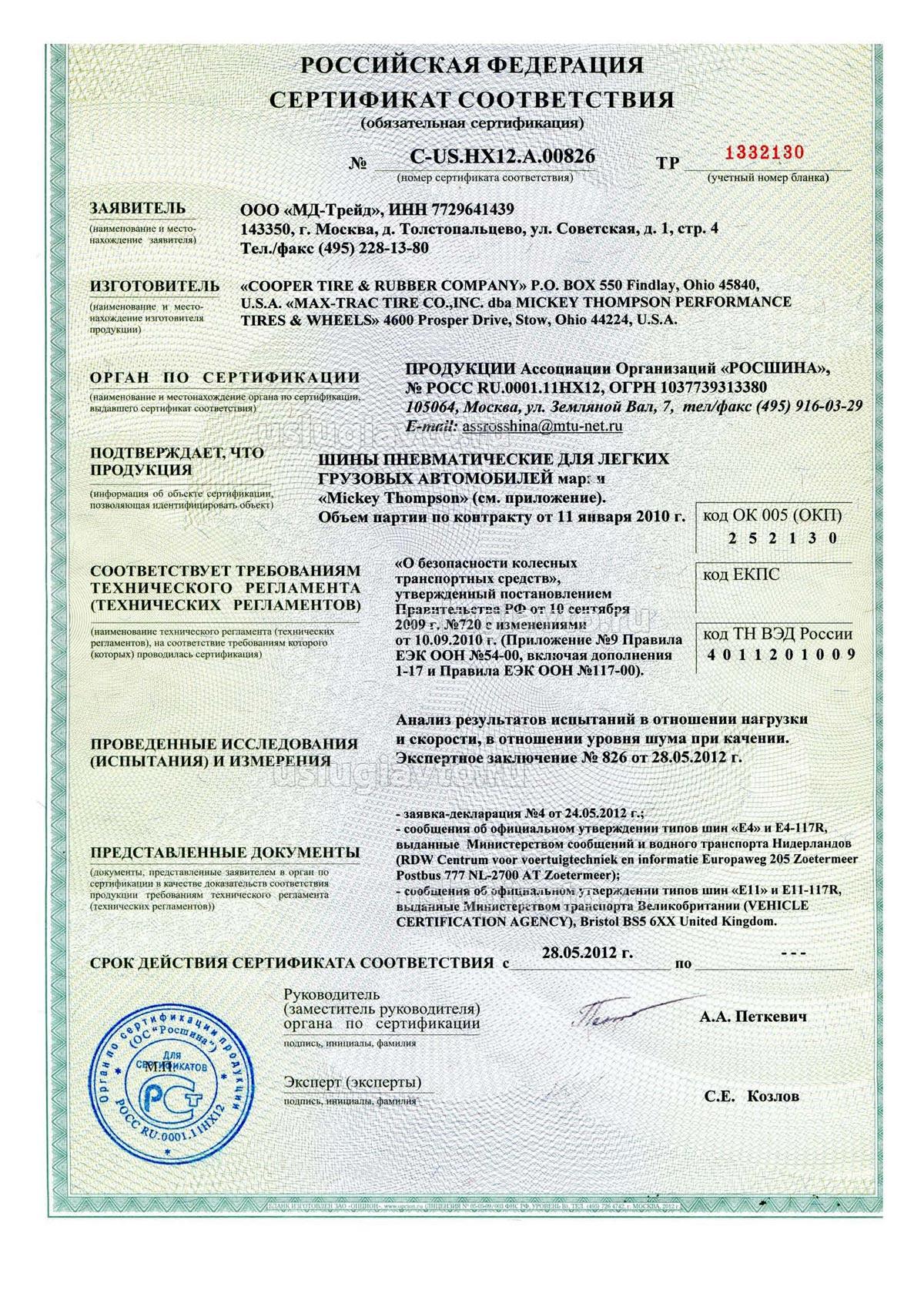 Сертификат № РОСС US.HX12.A04303 на продукцию "ШИНЫ ПНЕВМАТИЧЕСКИЕ ДЛЯ ЛЕГКИХ ГРУЗОВЫХ АВТОМОБИЛЕЙ мар: и «Mickey Thompson», изготовителя «COOPER TIRE & ROBBER COMPANY»", объем партии по контракту от 11 январи 2010 г.