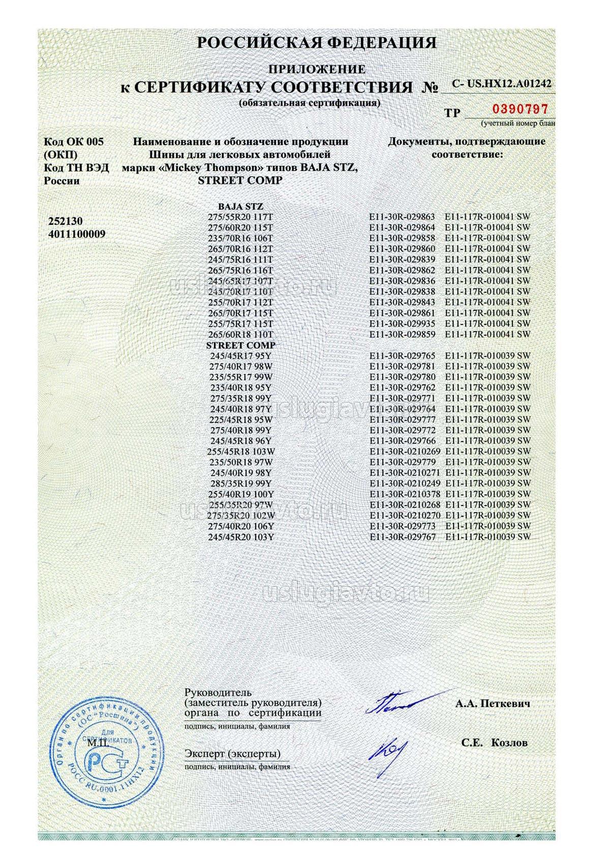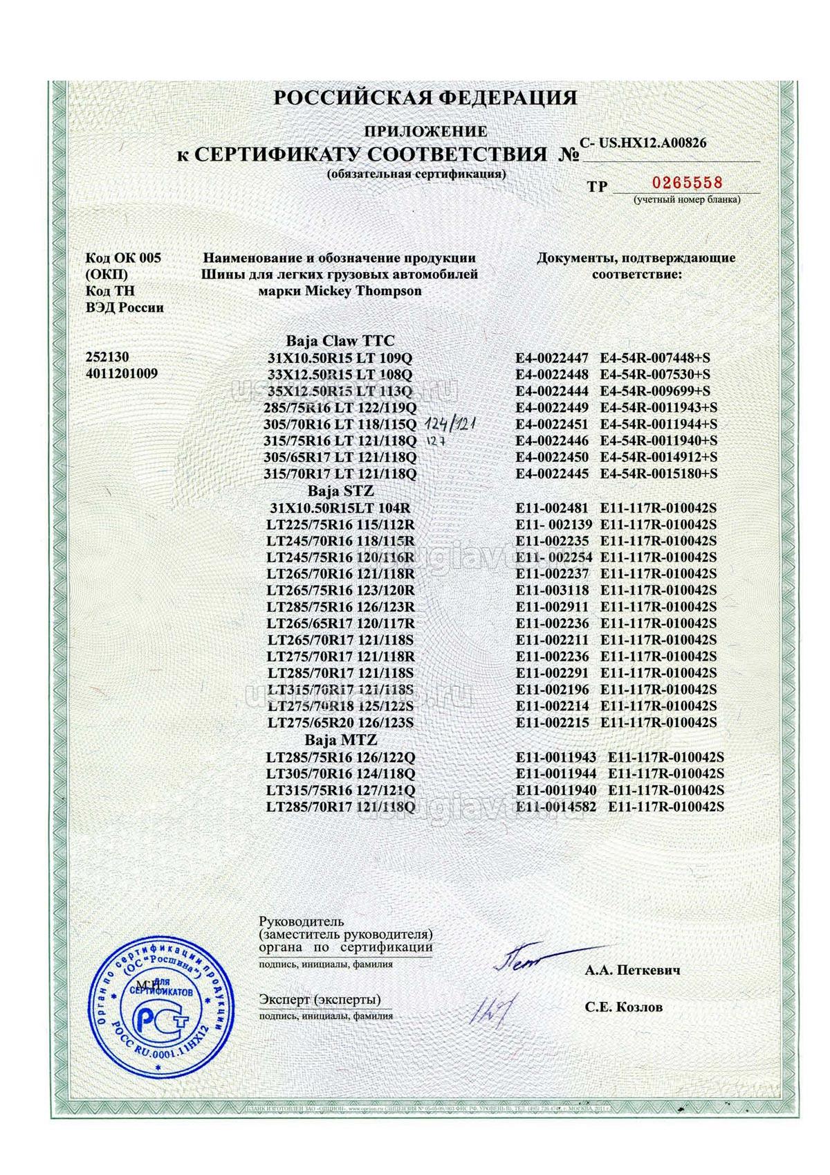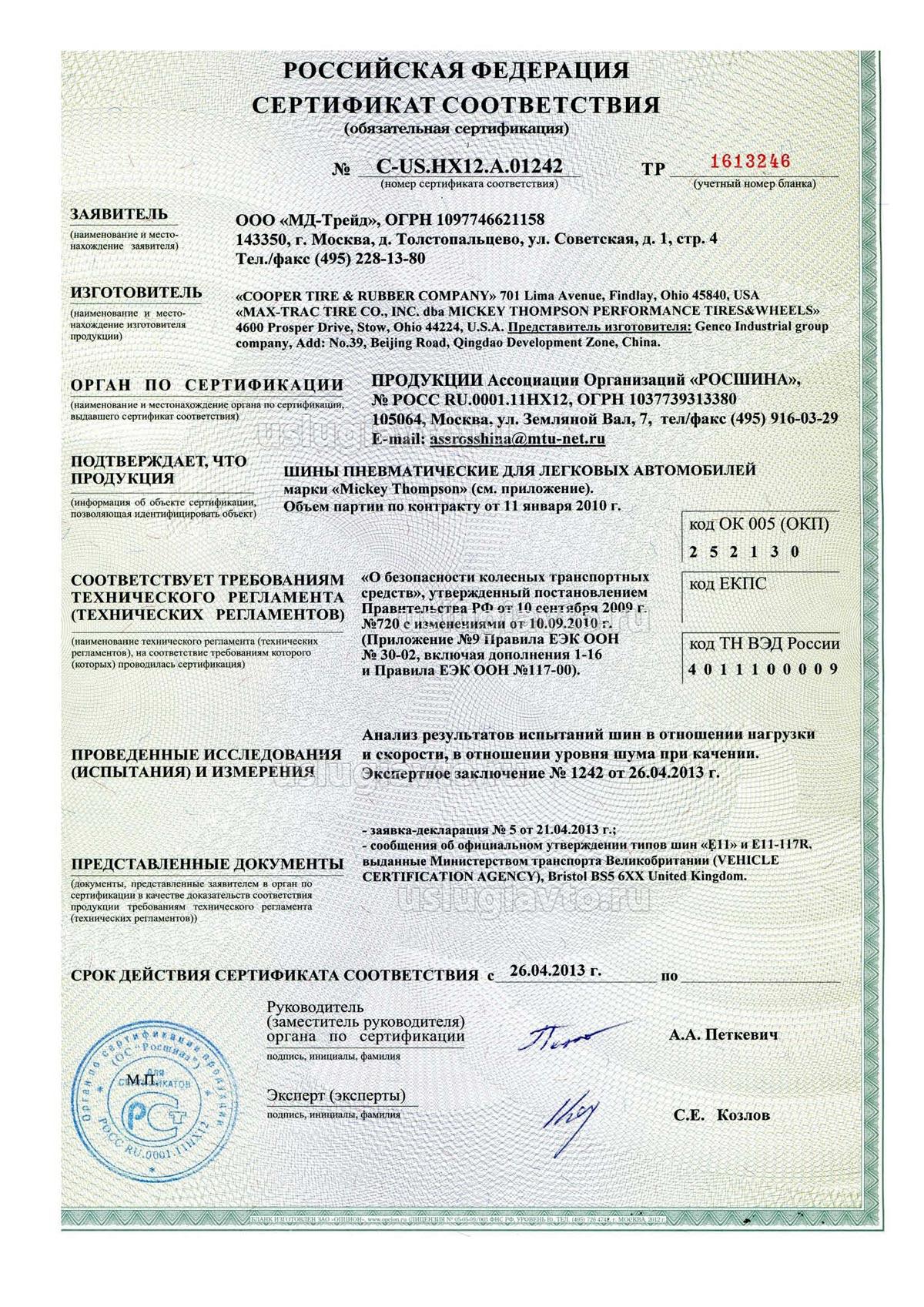 Сертификат № РОСС US.HX12.A04303 на продукцию "ШИНЫ ПНЕВМАТИЧЕСКИЕ ДЛЯ ЛЕГКИХ ГРУЗОВЫХ АВТОМОБИЛЕЙ мар: и «Mickey Thompson», изготовителя «COOPER TIRE & ROBBER COMPANY»", объем партии по контракту от 11 январи 2010 г.