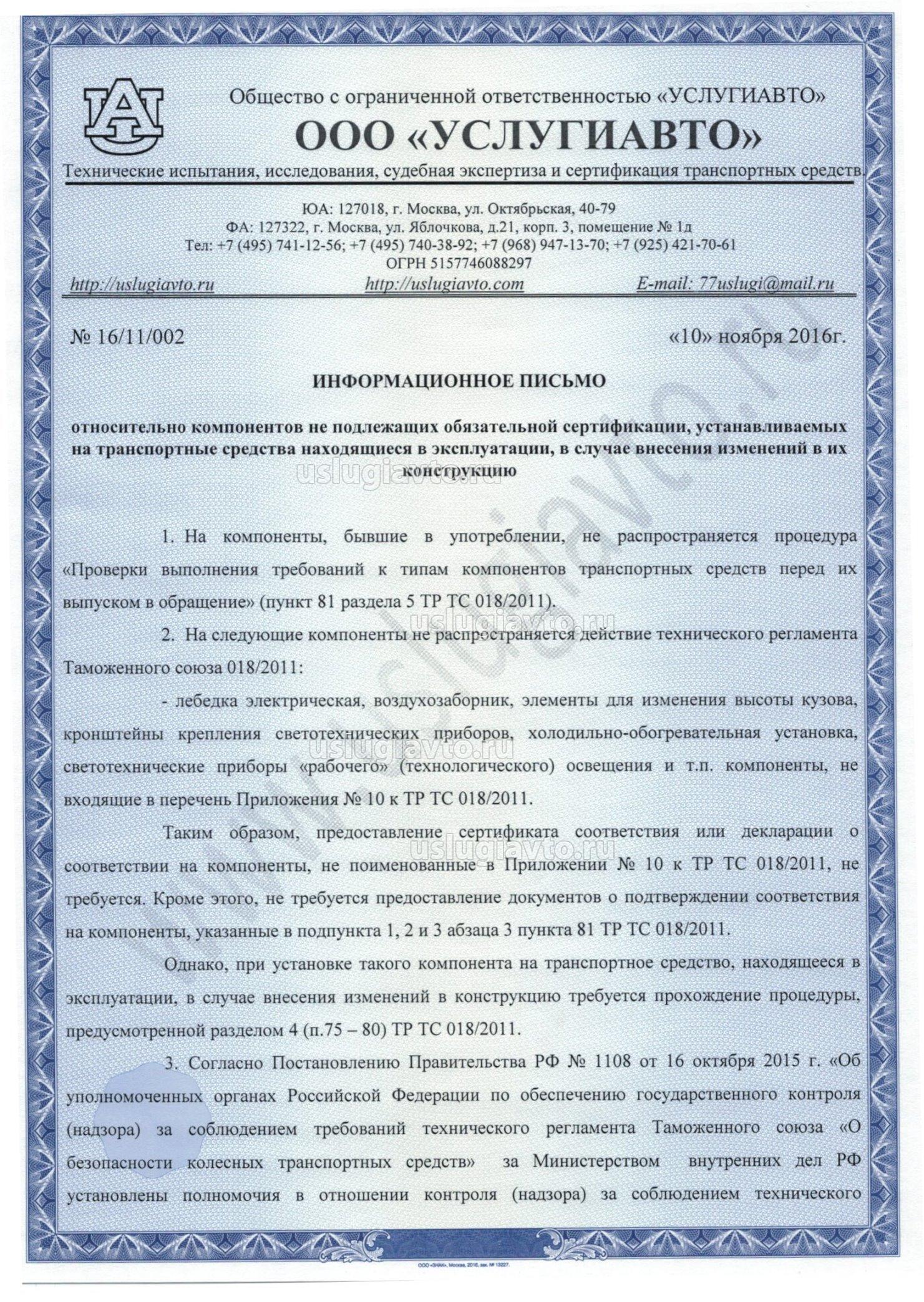 ИНФОРМАЦИОННОЕ ПИСЬМО относительно компонентов не подлежащих обязательной сертификации, устанавливаемых на транспортные средства находящиеся в эксплуатации, в случае внесения изменений в их конструкцию