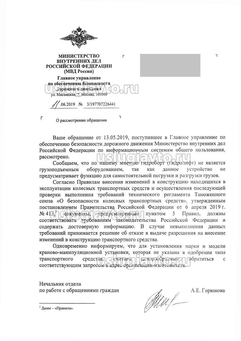 Алексеq писал(а):Добрый день. Подскажите возможно ли установить гидроборт на ам Валдай. ГИБДД говорит, что если в одобрение типа транспортного средства не указано, то установка запрещена. Так ли это? Спасибо
