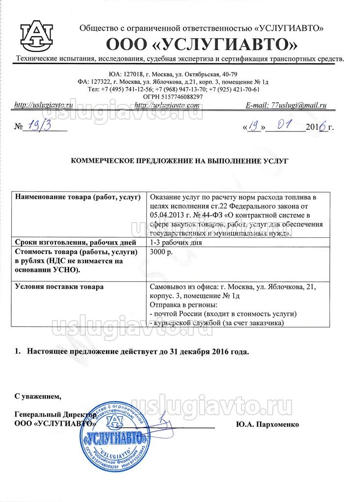 Коммерческое предложение по оказанию услуг расчета норм расхода топлива ТС от 25 марта 2016 г.