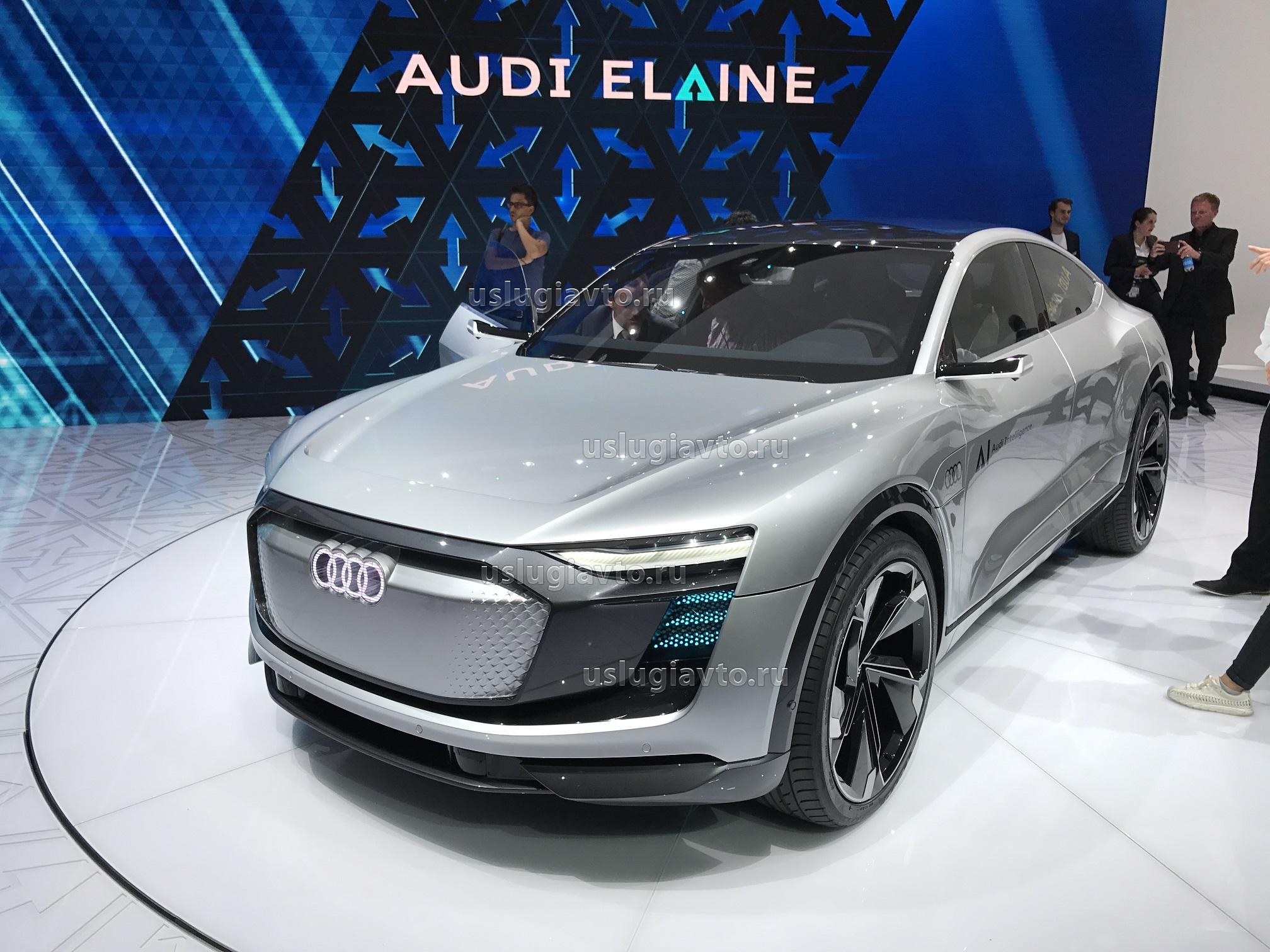 Elaine представляет собой доработанную версию концепта e-tron Sportback, представленного ранее в этом году на Шанхайском автосалоне. Новинка оснащена системой автономного передвижения 4-го уровня по классификации SAE. Концепт способен самостоятельно передвигаться не только в пробках (данную технологию Audi опробовала на новом A8), но и на шоссе. При этом водитель может в любой момент взять управление в свои руки.