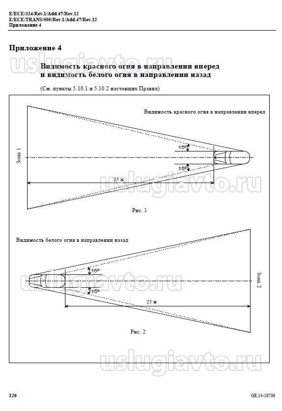 5.10.2 в отношении видимости белого света в направлении назад, за исключением задних фар и нанесенной на транспортное средство по бокам белой маркировки с улучшенными светоотражающими характеристиками, нужно, чтобы видимая поверхность белого огня не была непосредственно видима для наблюдателя, перемещающегося в зоне 2 поперечной плоскости на расстоянии 25 м сзади от транс-портного средства (см. приложение 4);