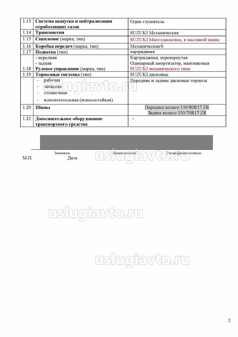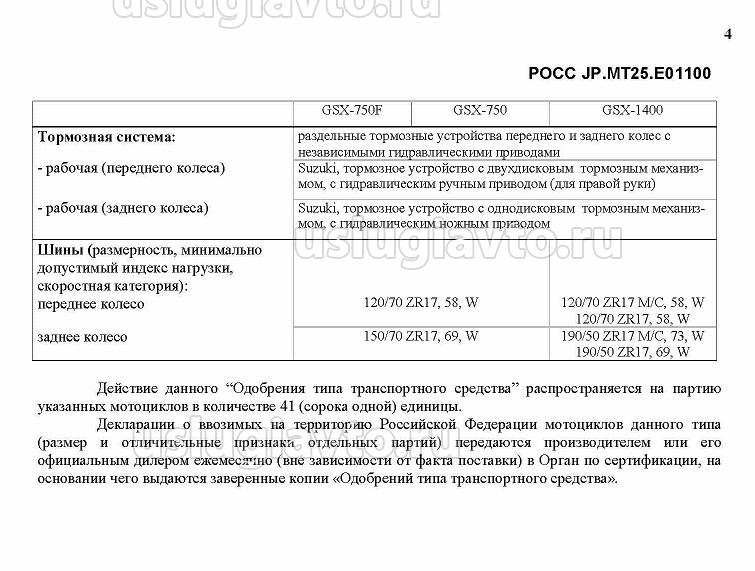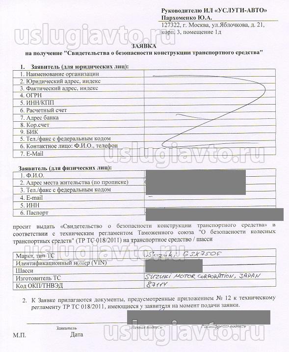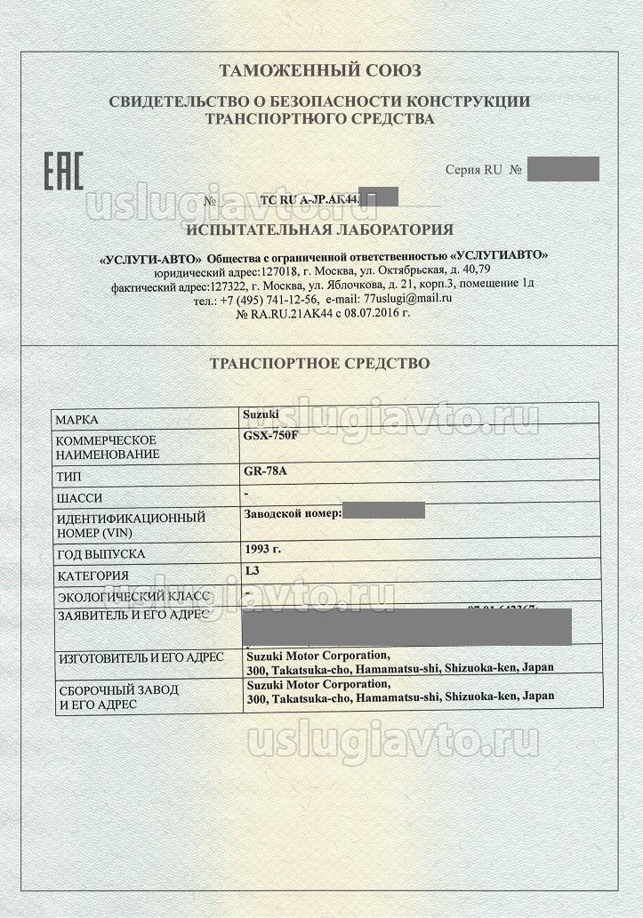 Пример оформления свидетельства о безопасности конструкции транспортного средства (СБКТС) для ввозного мотоцикла.