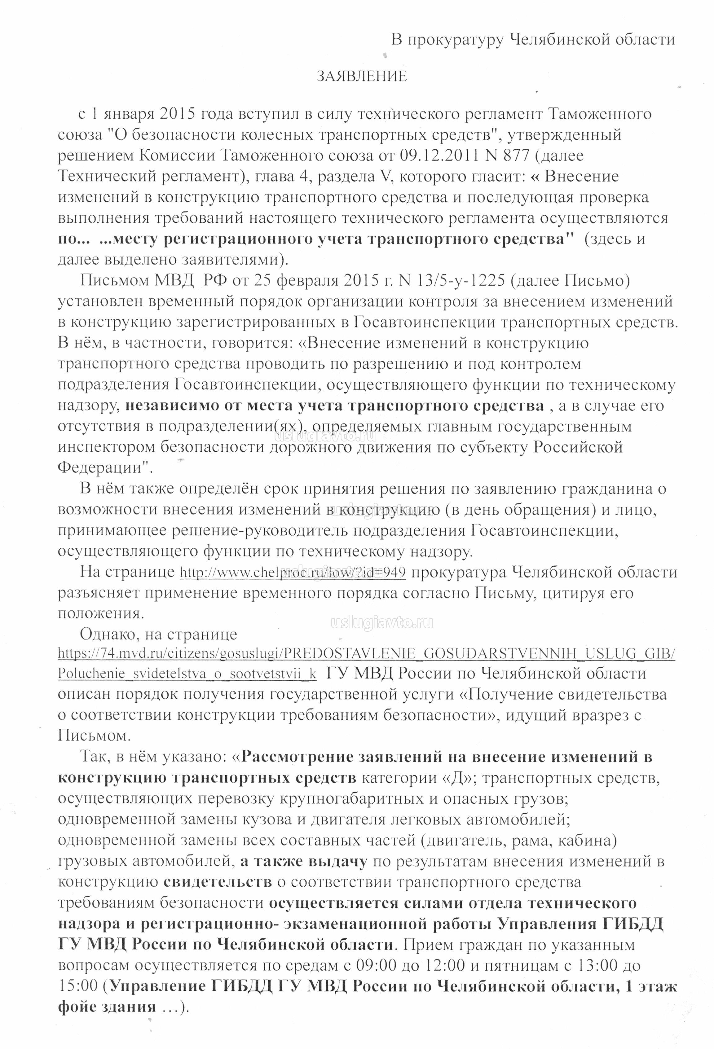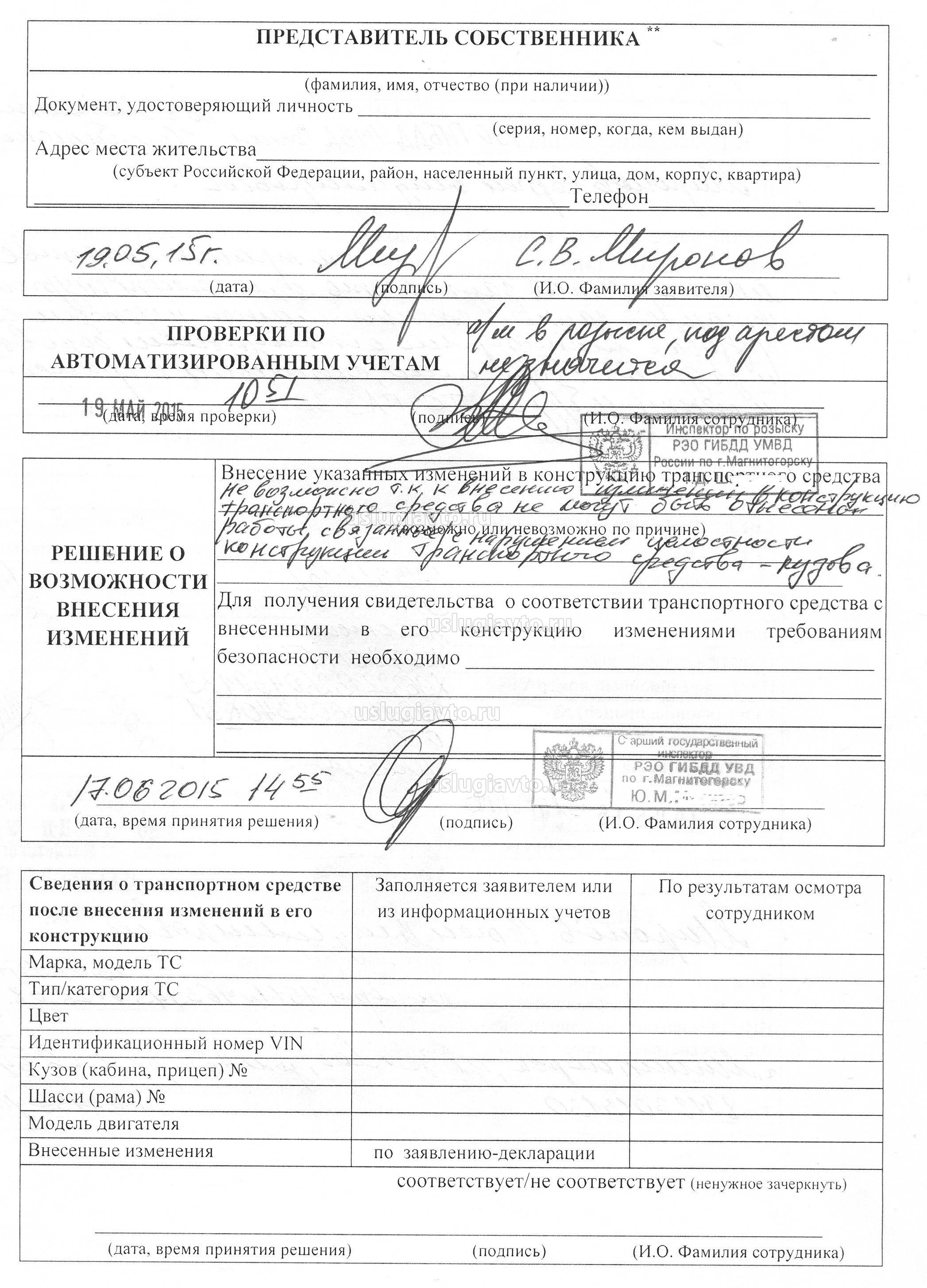 Как все уже увидели из моих сообщений мной был получен отказ из МРЭО ГИБДД г.Магнитогорскка на заявление о возможности изменений в конструкцию транспортного средства. Дословно отказ звучит так (орфография оригинала): "Внесение изменений в конструкцию транспортного средства не возможно т.к. к внесению изменений в конструкцию транспортного средства не могут быть отнесены работы, связанные с нарушением целостности конструкции транспортного средства-кузова " (вроде это цитирование п.35.4 приложения 2 приказа 1001, отменённого (о пункте) приказом 605-могу ошибаться). И всё, никаких ссылок на НПА, ничего!