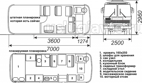 7 оборудовать сзади спальную комнату и несколько отдельных спальных мест, кухню (установить холодильник, микроволновку, стиралку, и т.д.)