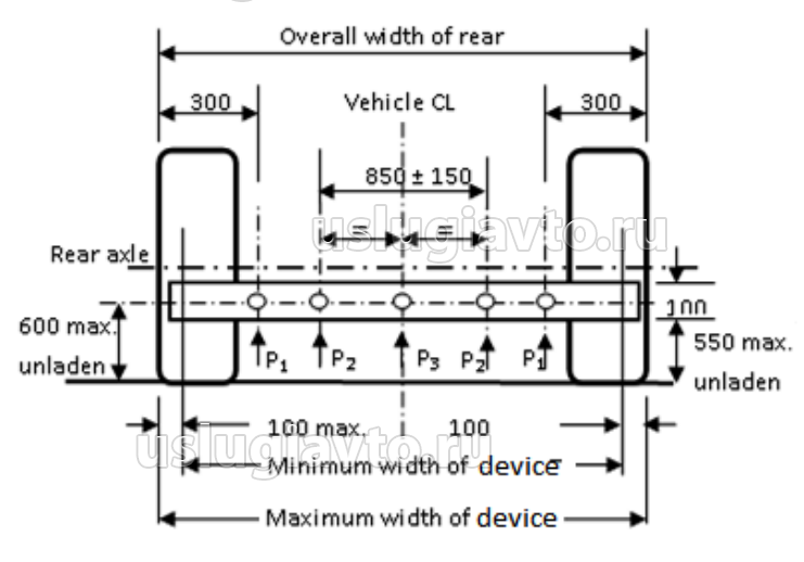 25.3 Ширина ЗПЗ ни в коем случае не должна превышать длину задней оси замеренной по наиболее удаленным точкам колес, исключая выпуклые част шин у поверхности земли, и в то же время не должна быть короче ее более че на 100 мм с каждой стороны. При наличии нескольких задних осей в расчете принимается длина самой длинной задней оси. В случаях, когда устройство встроено в кузов транспортного средства или представляет собой его неотъемлемую часть, а ширина самого кузова превышает длину задней оси, требование в отношении того, что ширина ЗПЗ не должна превышать длину задней оси, не применяется.