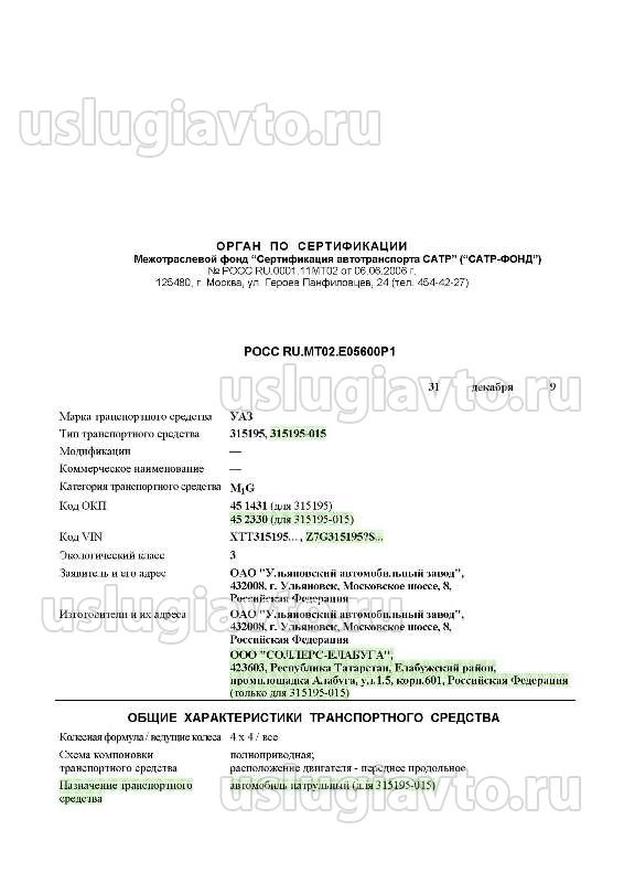 Пример ОТТС автомобилей "УАЗ" после 2006 года выпуска: