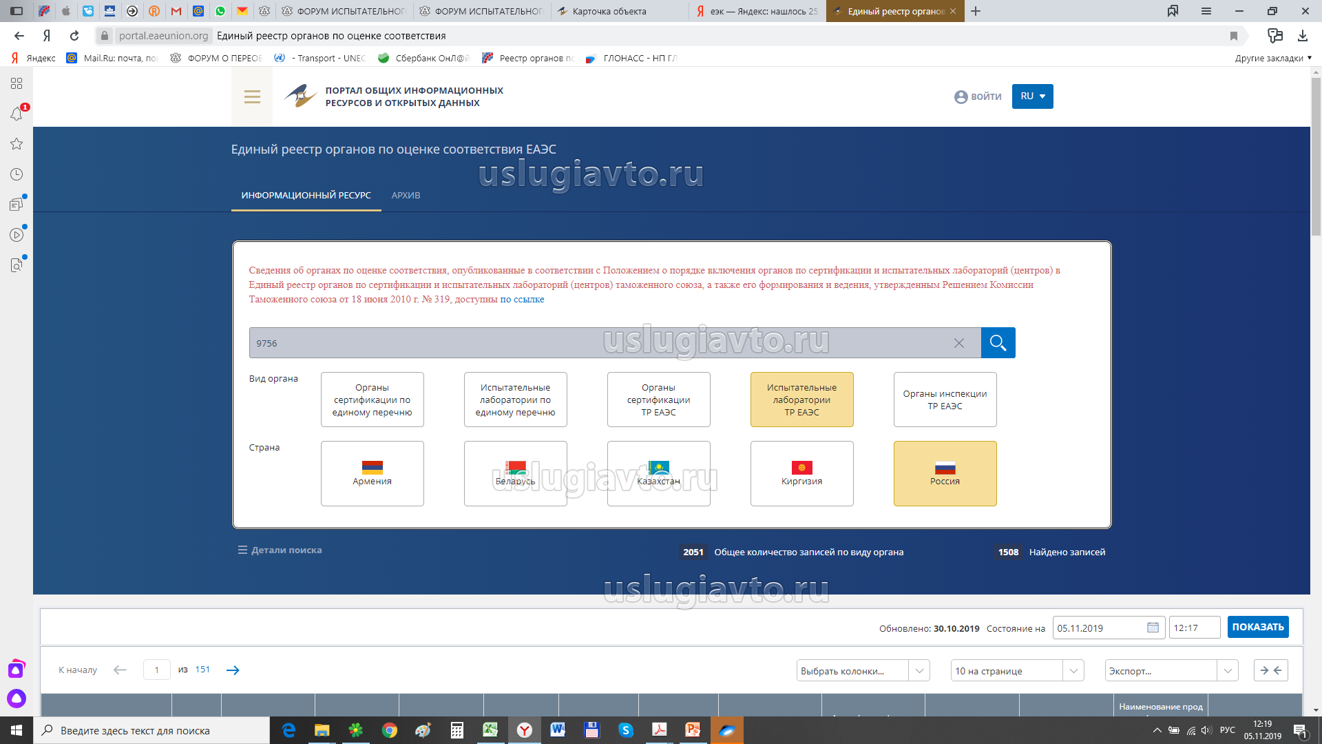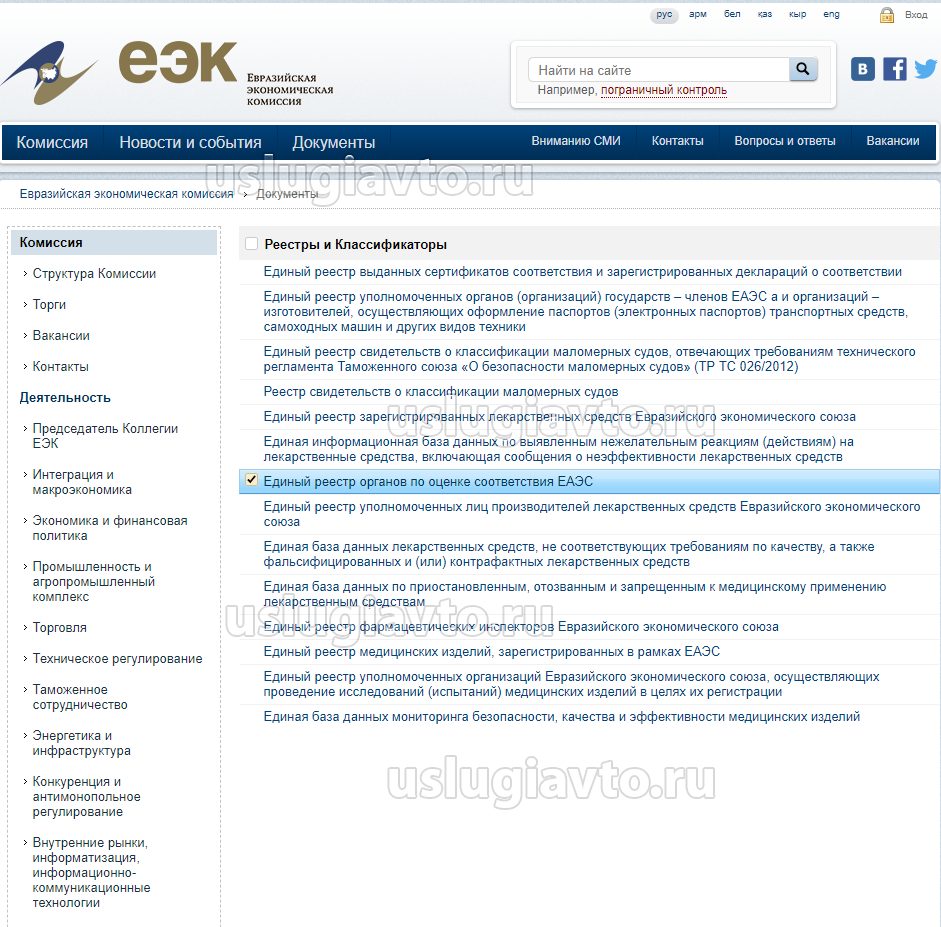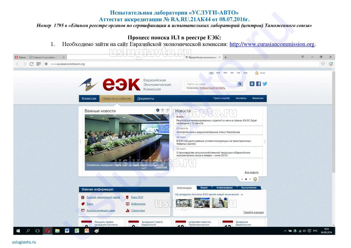 Инструкция по поиску испытательной лаборатории "УСЛУГИ-АВТО" на портале ЕЭК (№ 1795 в реестре ЕЭК)