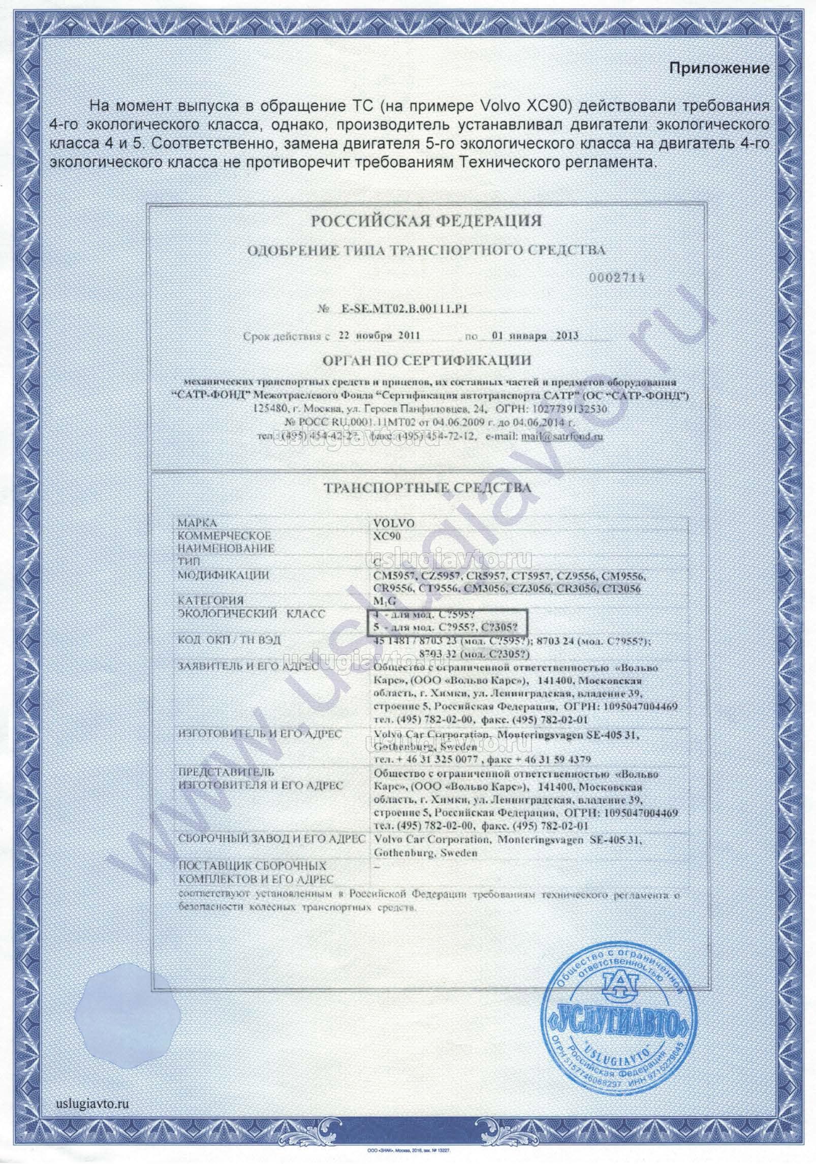 На момент выпуска в обращение ТС (на примере Volvo XC90) действовали требования 4-го экологического класса, однако, производитель устанавливал двигатели экологического класса 4 и 5. Соответственно, замена двигателя 5-го экологического класса на двигатель 4-го экологического класса не противоречит требованиям Технического регламента.