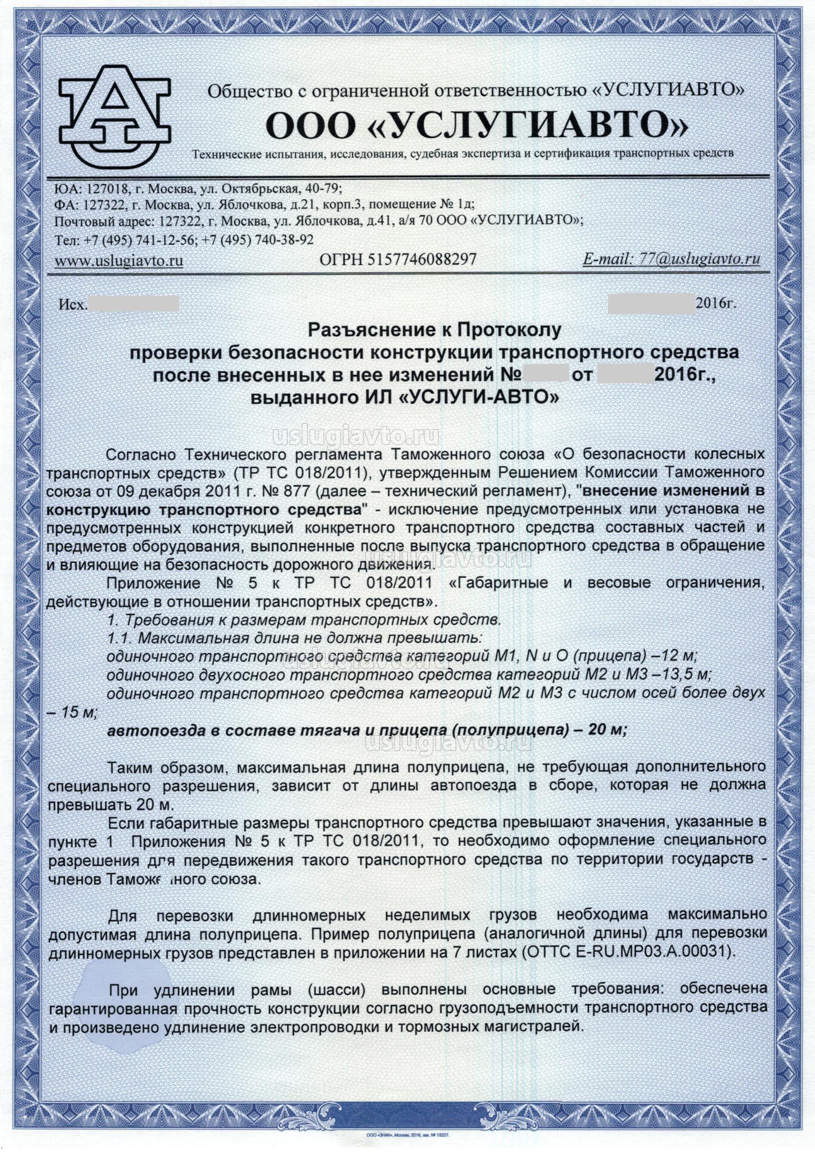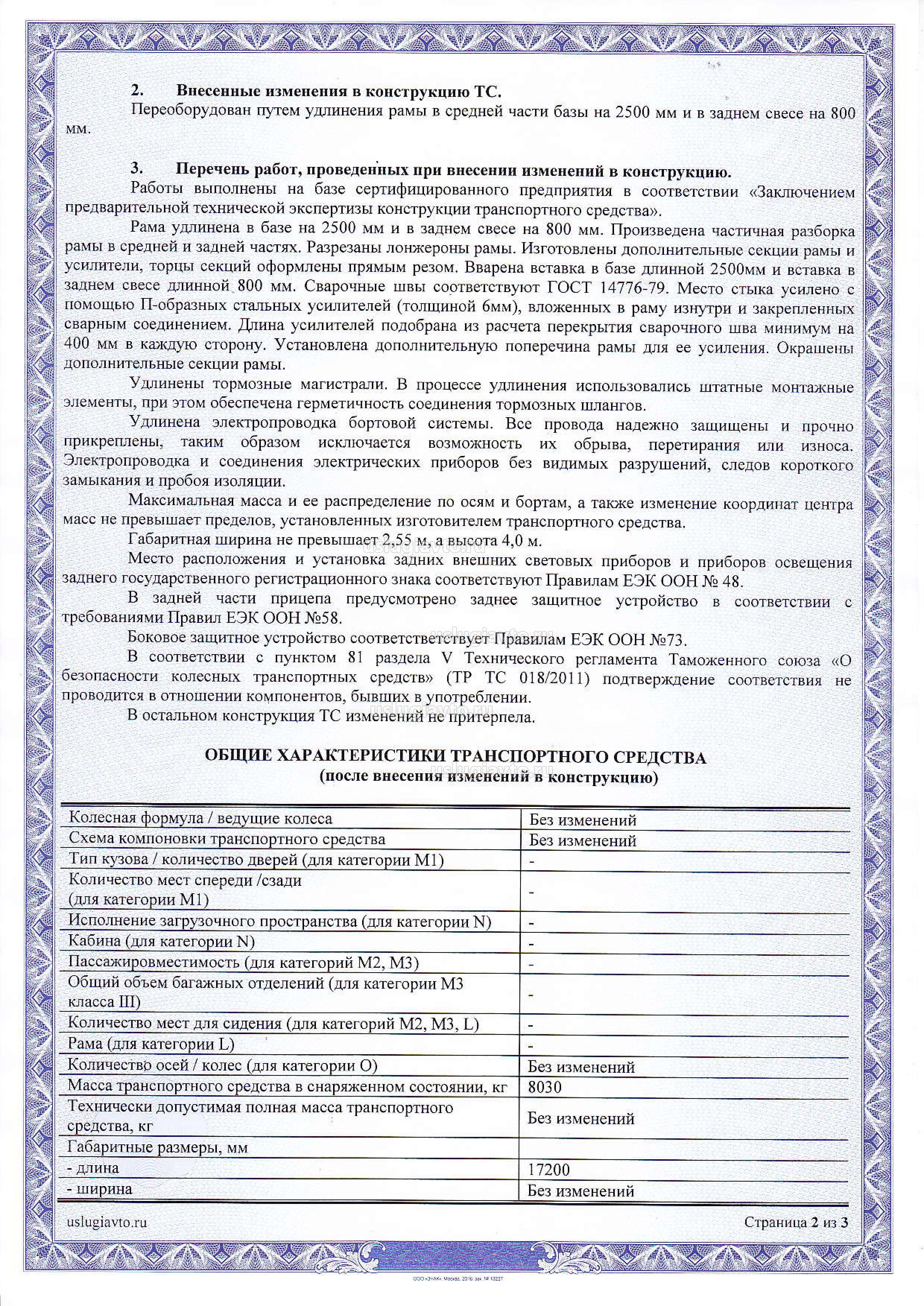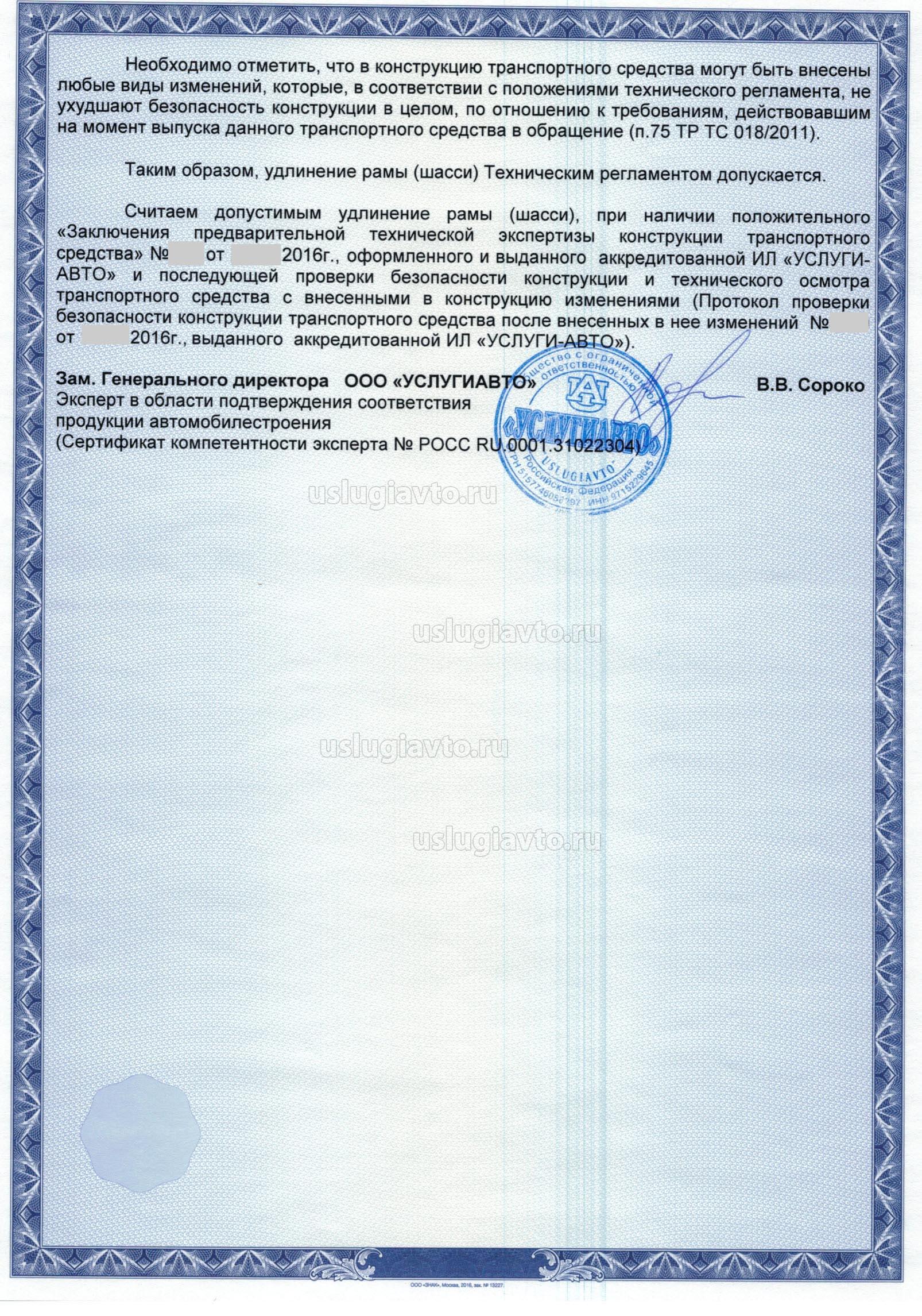 Считаем допустимым удлинение рамы (шасси), при наличии положительного «Заключения предварительной технической экспертизы конструкции транспортного средства» №485 от 23.09.2016г., оформленного и выданного аккредитованной ИЛ «УСЛУГИ-АВТО» и последующей проверки безопасности конструкции и технического осмотра транспортного средства с внесенными в конструкцию изменениями (Протокол проверки безопасности конструкции транспортного средства после внесенных в нее изменений №3070 от 18.11.2016г., выданного аккредитованной ИЛ «УСЛУГИ-АВТО»).