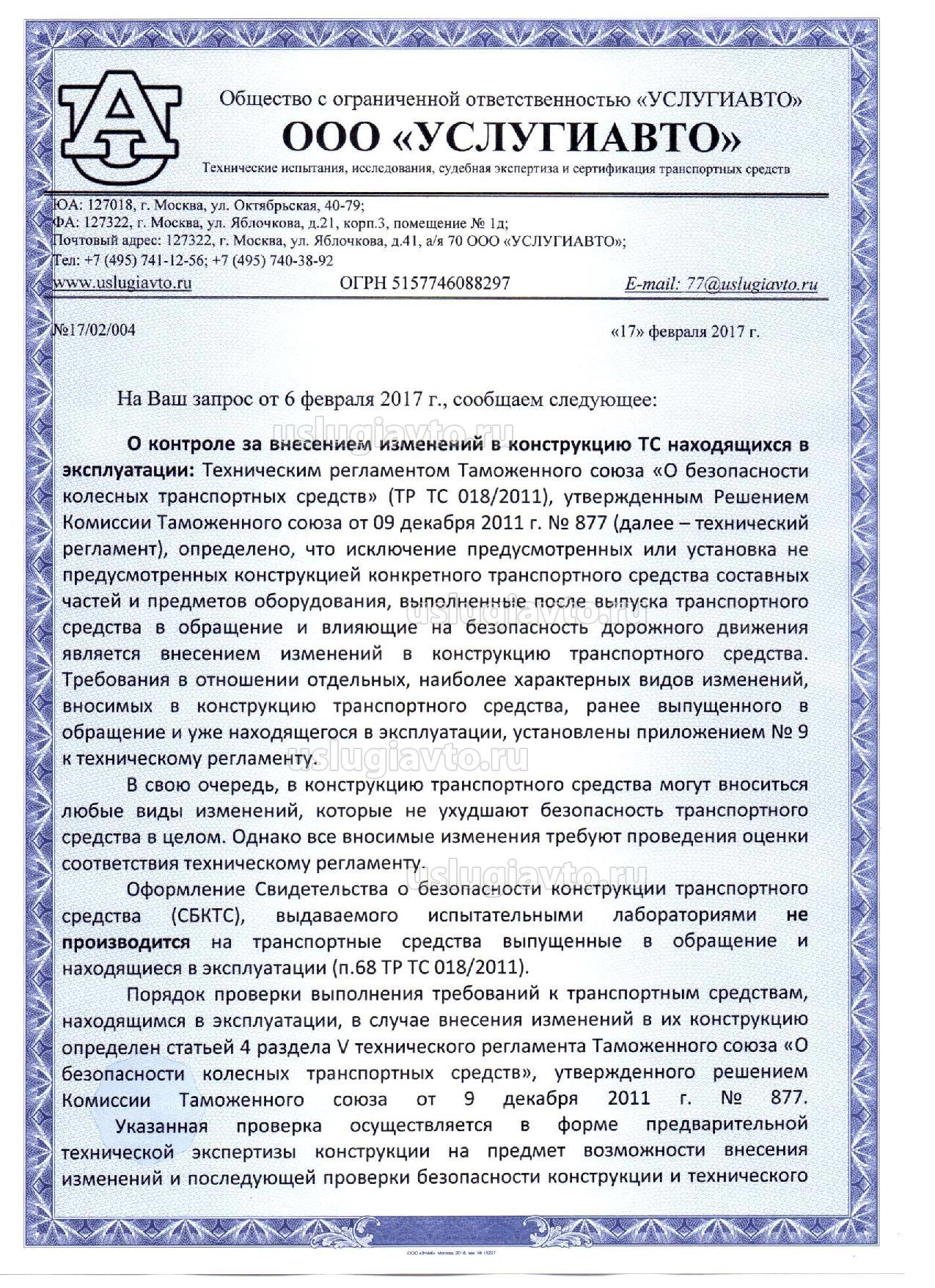 Необходимо отметить, что в конструкцию транспортного средства могут быть внесены любые виды изменений, которые, в соответствии с положениями технического регламента, не ухудшают безопасность конструкции в целом, по отношению к требованиям, действовавшим на момент выпуска данного транспортного средства в обращение.