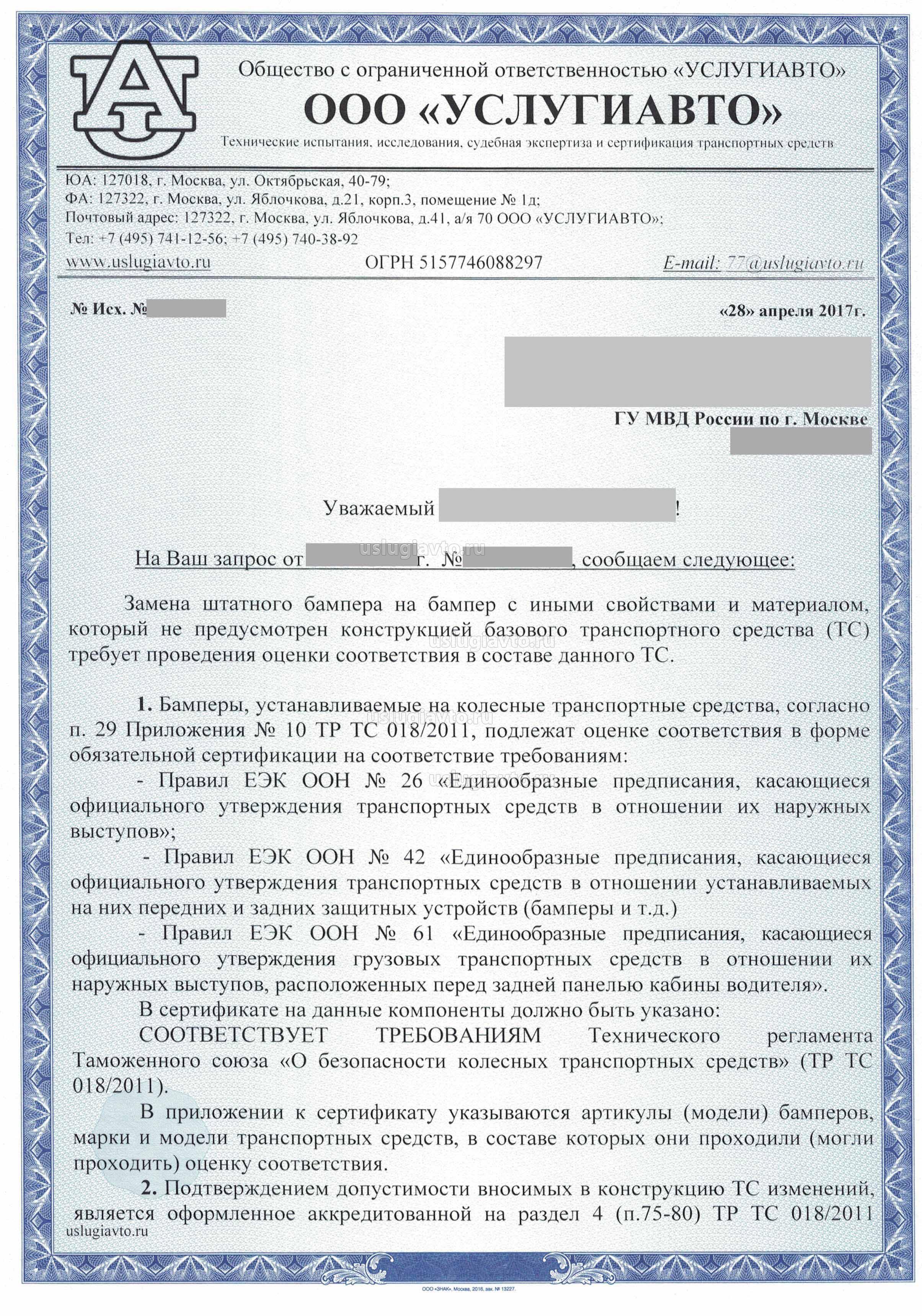 В настоящее время собственники транспортных средств в массовом порядке легализуют установленные на транспортных средствах усиленные бампера («кенгурятники»), различного рода трубы, устанавливаемые под штатный бампер транспортного средства, лебедки, экспедиционные багажники, колеса повышенного диаметра, и прочее дополнительное оборудование (шноркель, тросики от передних стоек до капота, подножки, расширители колесных арок и др.), а также увеличение дорожного просвета, путем установки проставок. На указанное оборудование, согласно приложения № 10 Технического регламента о безопасности колесных транспортных средств ТР ТС 018/2011, требование прохождение сертификации продукции не распространяется. Одновременно с этим, пунктом 10.8. ТР ТС 018/2011 не допускается деформация вследствие повреждений или изменение конструкции передних и задних бамперов транспортных средств категорий М и N, при которых радиус кривизны выступающих наружу частей бампера (за исключением деталей, изготовленных из неметаллических эластичных материалов) менее 5 мм;