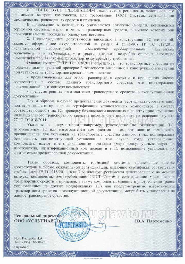 Таким образом, компоненты тормозной системы, подлежащие оценке соответствия в форме обязательной сертификации, имеющие сертификат соответствия требованиям ТР ТС 018/2011, или Технического регламента действовавшего на момент выпуска компонента, или требованиям ГОСТ Системы сертификации механических транспортных средств и прицепов, а также компоненты, бывшие в употреблении (ранее установленные на других модификациях ТС) или предусмотренные изготовителем транспортного средства в эксплуатационной документации, могут быть установлены на данное транспортное средство.