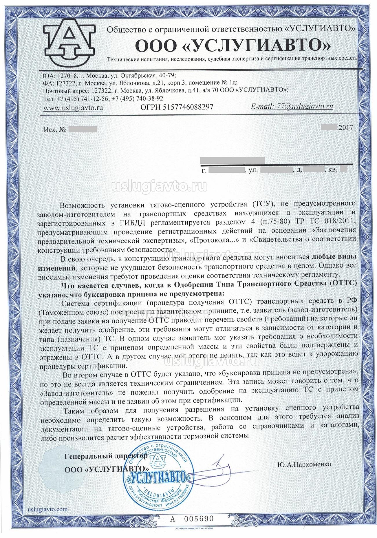 1) Возможность установки тягово-сцепного устройства (ТСУ), не предусмотренного заводом-изготовителем на транспортных средствах находящихся в эксплуатации и зарегистрированных в ГИБДД регламентируется разделом 4 (п.75-80) ТР ТС 018/2011, предусматривающим проведение регистрационных действий на основании «Заключения предварительной технической экспертизы», «Протокола...» и «Свидетельства о соответствии конструкции требованиям безопасности».