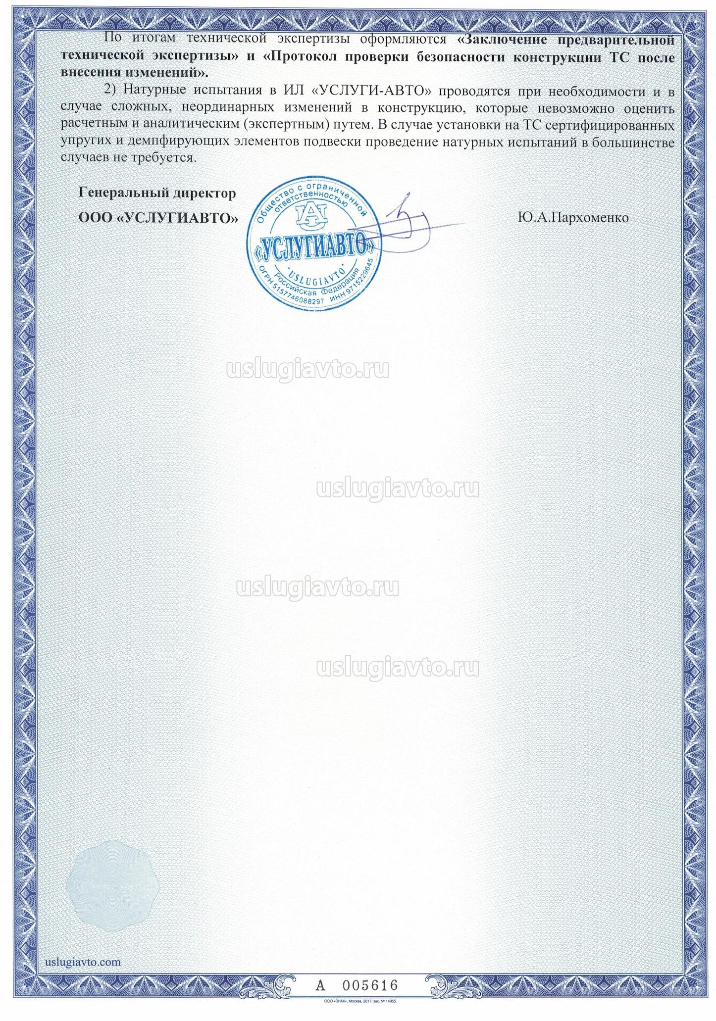 2) Натурные испытания в ИЛ «УСЛУГИ-АВТО» проводятся при необходимости и в случае сложных, неординарных изменений в конструкцию, которые невозможно оценить расчетным и аналитическим (экспертным) путем. В случае установки на ТС сертифицированных упругих и демпфирующих элементов подвески проведение натурных испытаний в большинстве случаев не требуется.