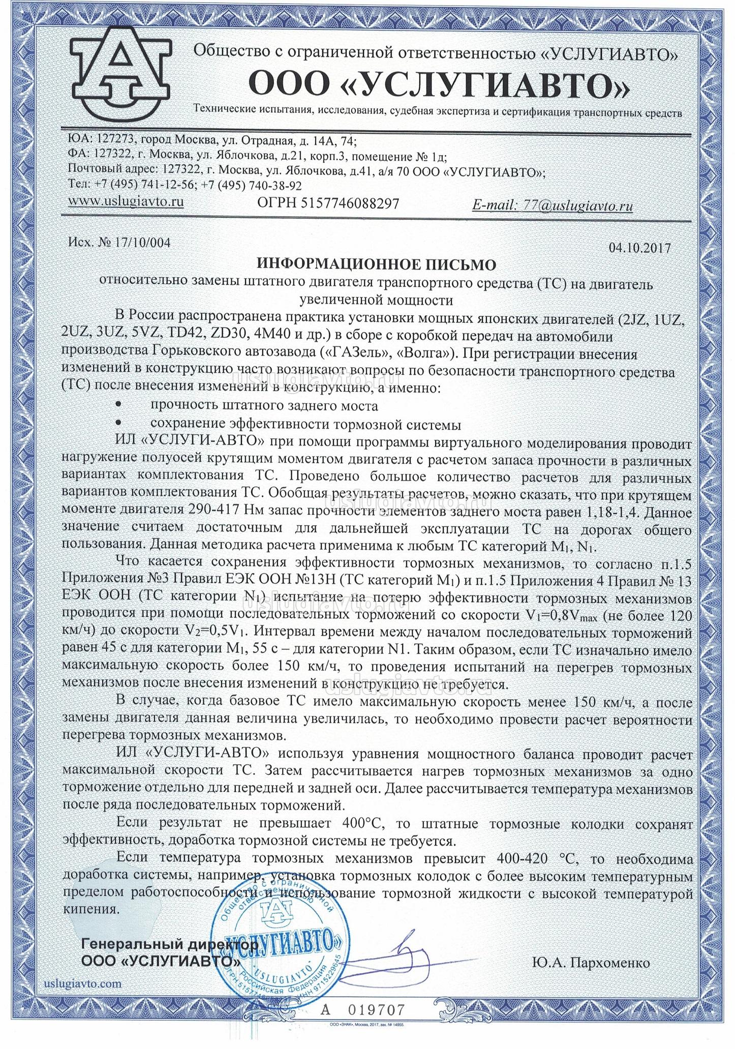 Считаем допустимым замену штатного двигателя на двигатель другой модели, при наличии положительного «Заключения предварительной технической экспертизы конструкции транспортного средства» оформленного и выданного аккредитованной испытательной лабораторией.