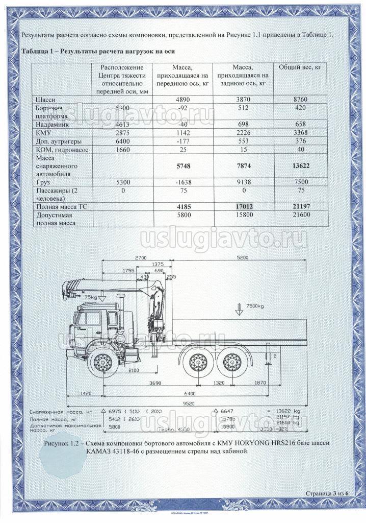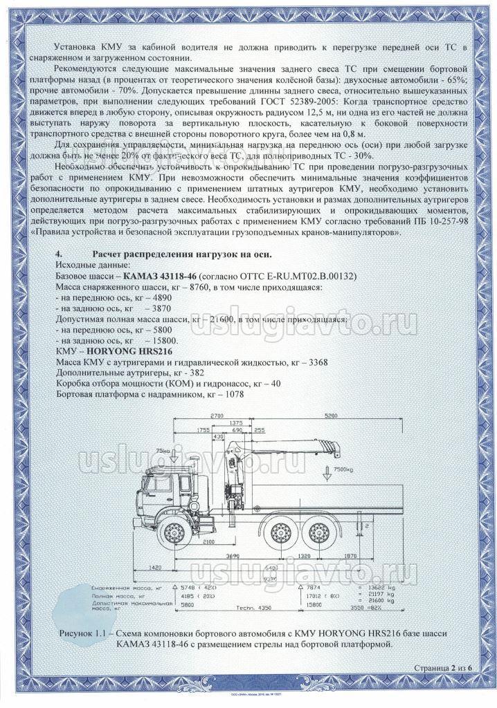 Установка КМУ HORYONG HRS216 за кабиной и бортовой платформы длиной 5200 мм, не приводит к перегрузке осей ТС КАМАЗ 43118-46 при выполнении следующих условий при перевозке грузов: