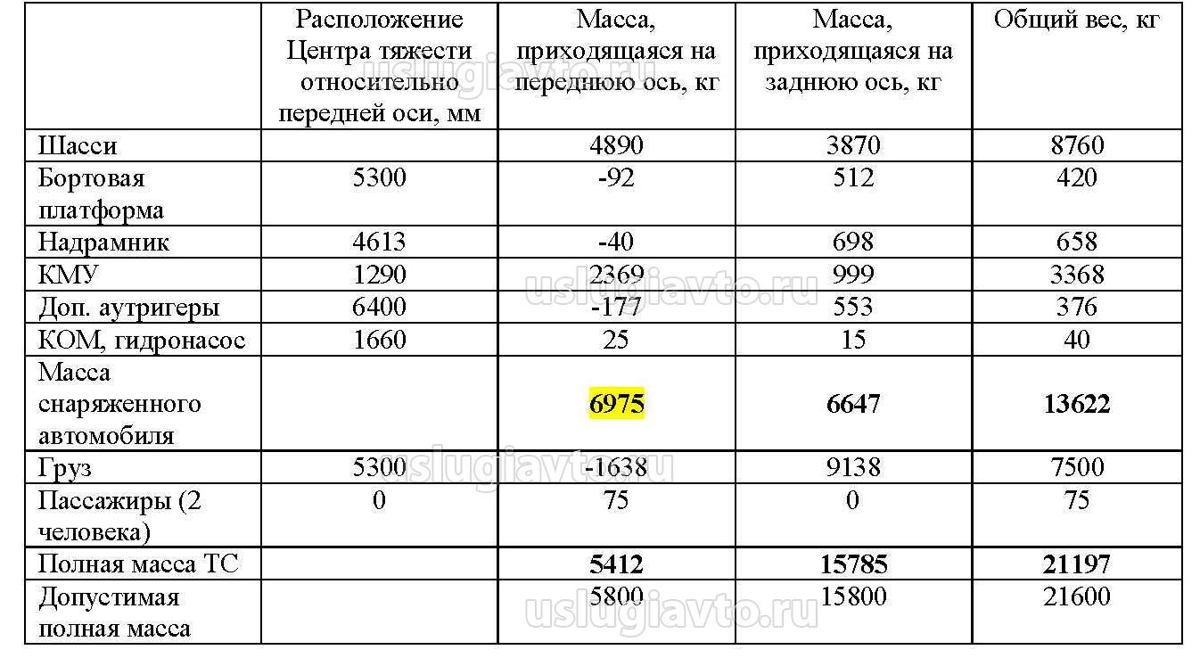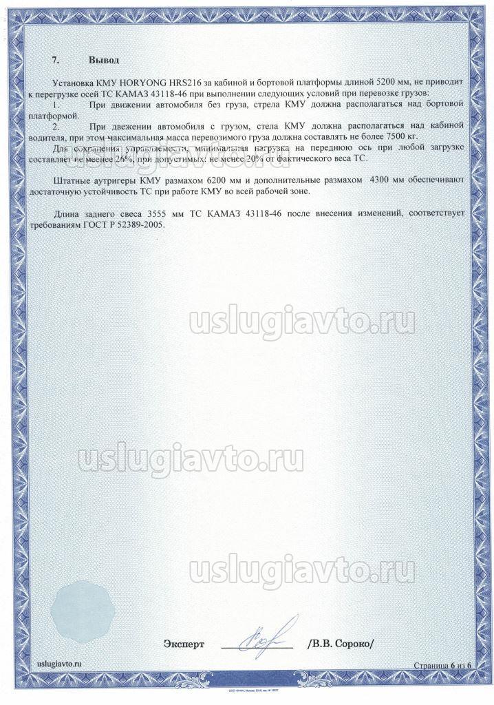 Проанализировав полученные данные, делаем вывод, что установка КМУ HORYONG HRS216 за кабиной и бортовой платформы длиной 5200 мм, не приводит к перегрузке осей ТС КАМАЗ 43118-46 при выполнении следующих условий при перевозке грузов: