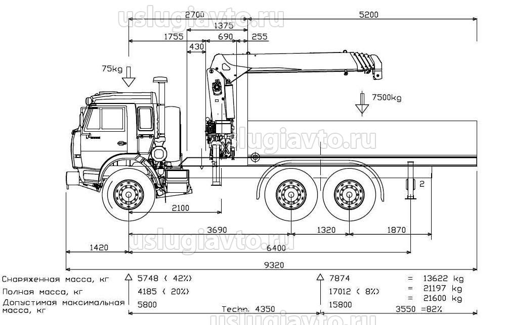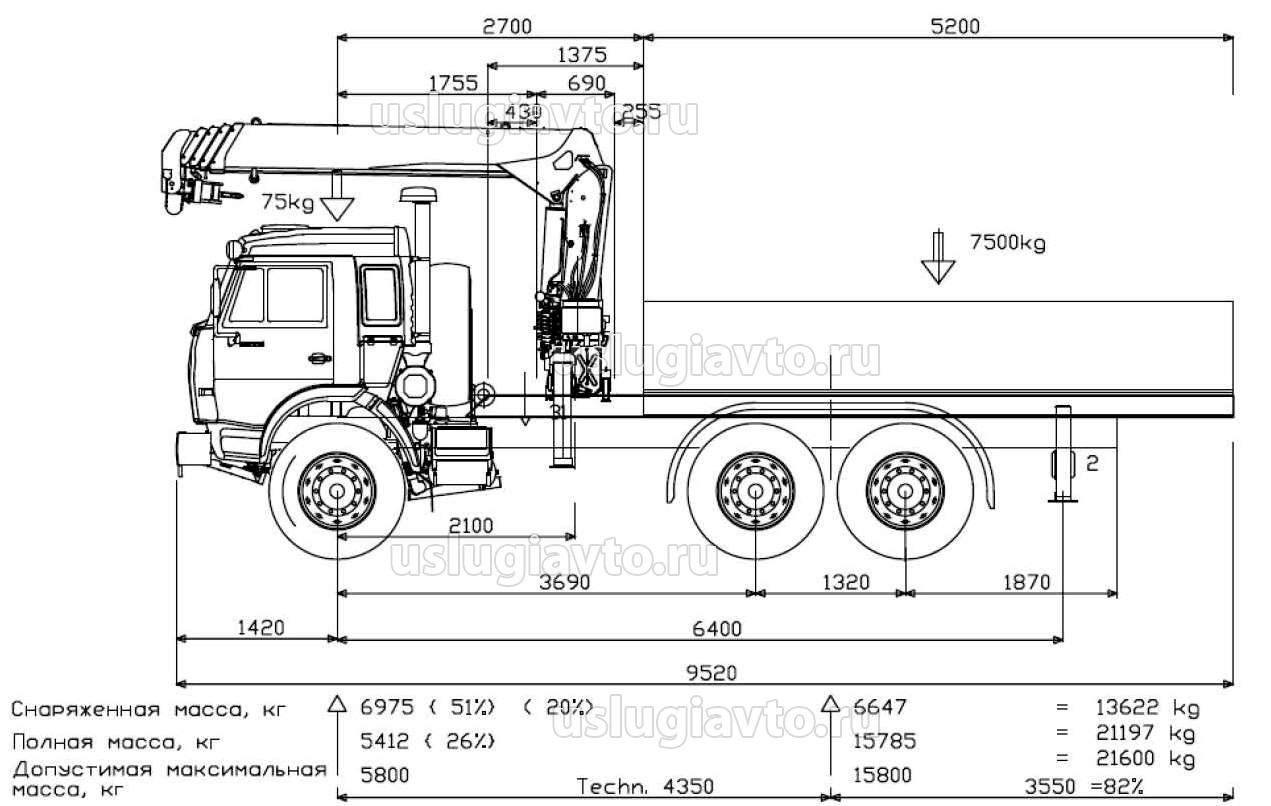 2. При двежении автомобиля с грузом, стела КМУ должна располагаться над кабиной водителя, при этом максимальная масса перевозимого груза должна составлять не более 7500 кг.
