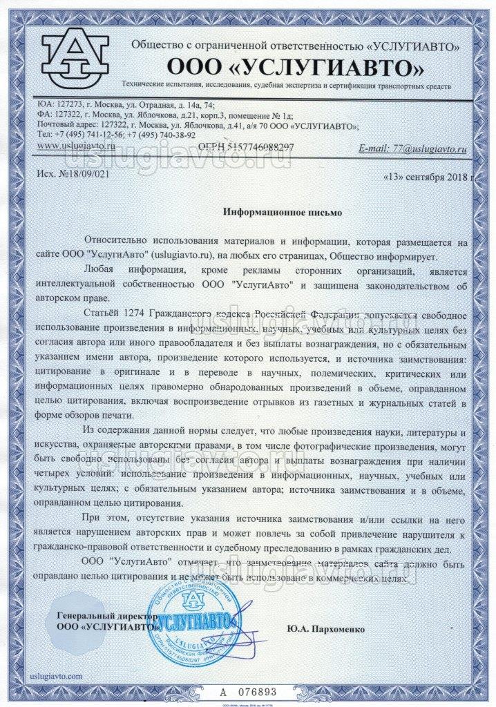 При использовании текстовых материалов портала, сайта в печатных изданиях (газетах, журналах, книгах, или в иных формах использования на материальных носителях (бумага, фотографии, баннеры, плакаты и т.п.) пользователь в каждом случае использования обязан указывать, что источником информации является сайт «www.uslugiavto.ru» и (или) «www.uslugiavto.com».