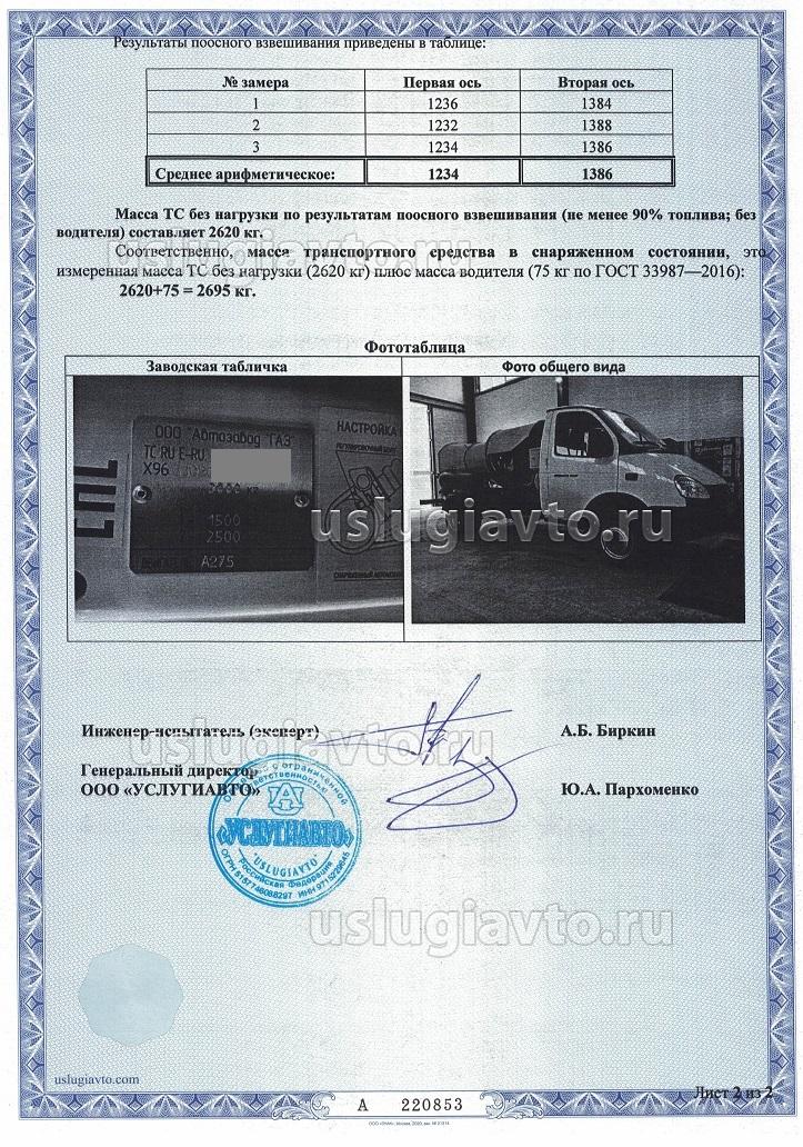 Процедура внесения реальной снаряженной массы ТС в ПТС:1. Взвешивание ТС проводится на поверенных весах в испытательной лаборатории «УСЛУГИ-АВТО» по ГОСТ 33987-2016 «Транспортные средства колесные. Массы и размеры. Технические требования и методы определения» с оформлением акта взвешивания.