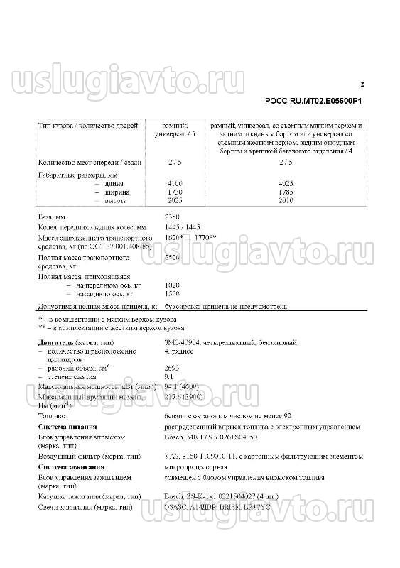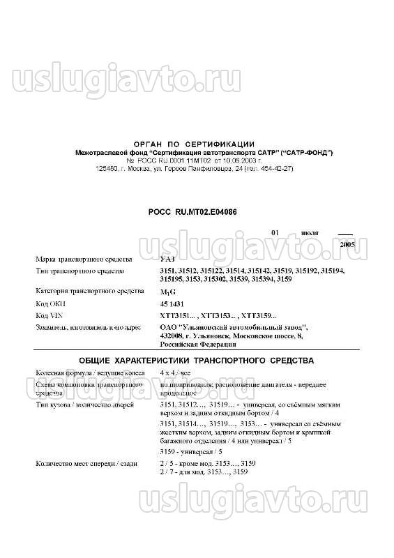 Пример ОТТС автомобилей "УАЗ" до 2006 года выпуска: