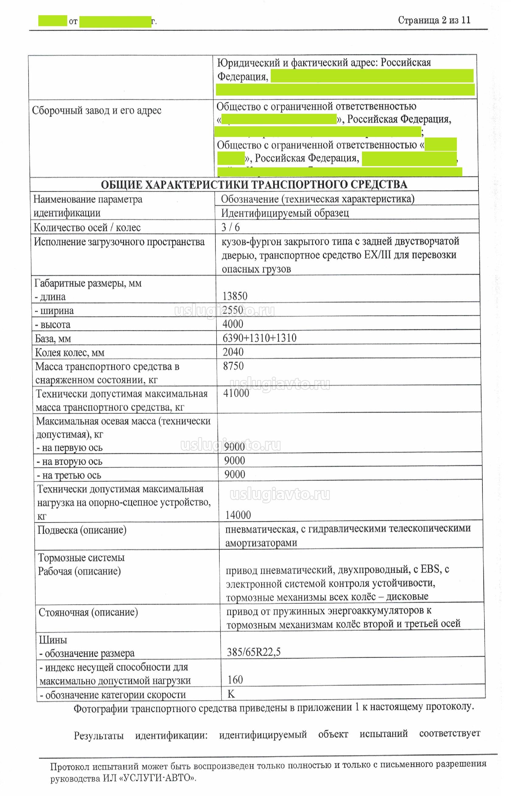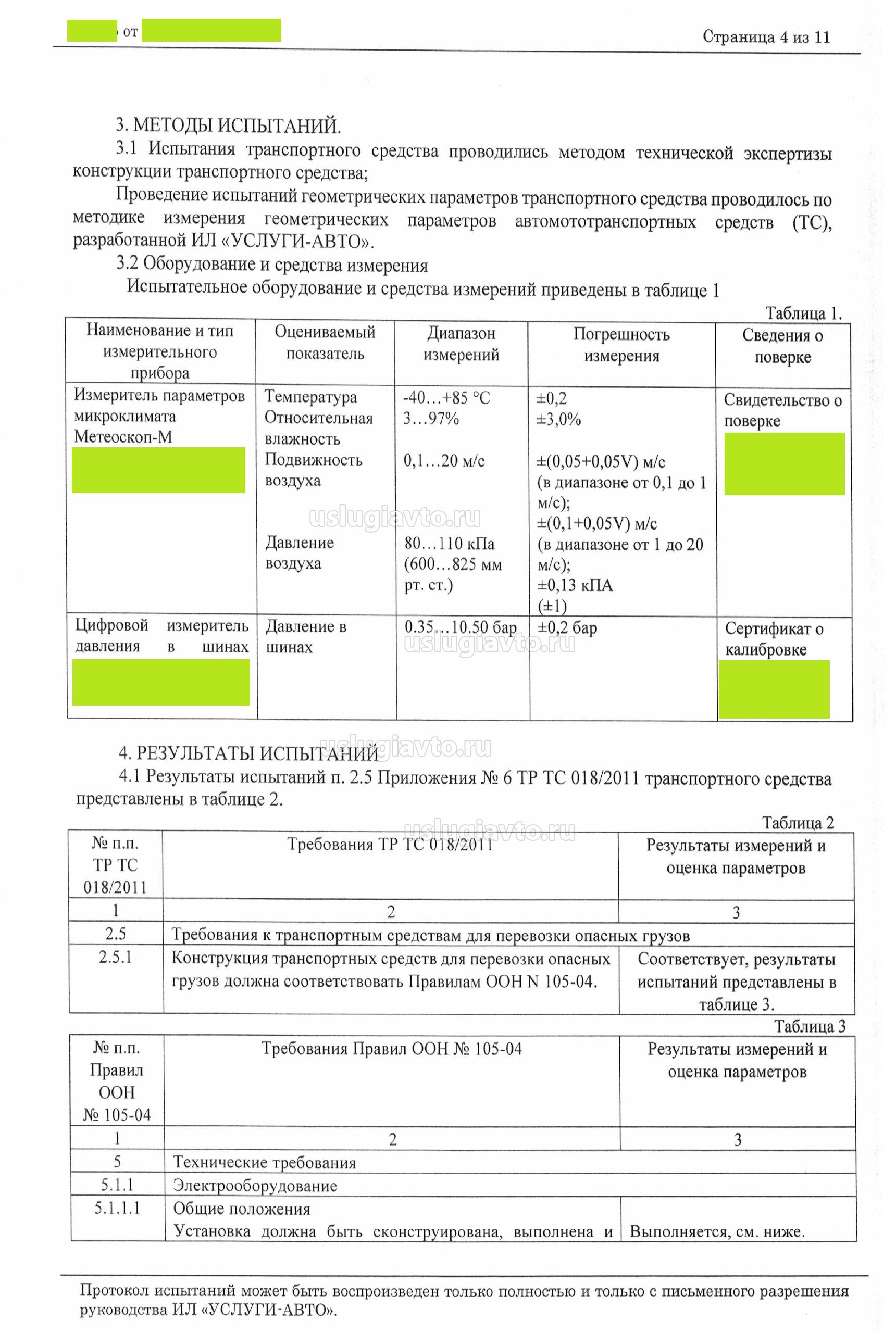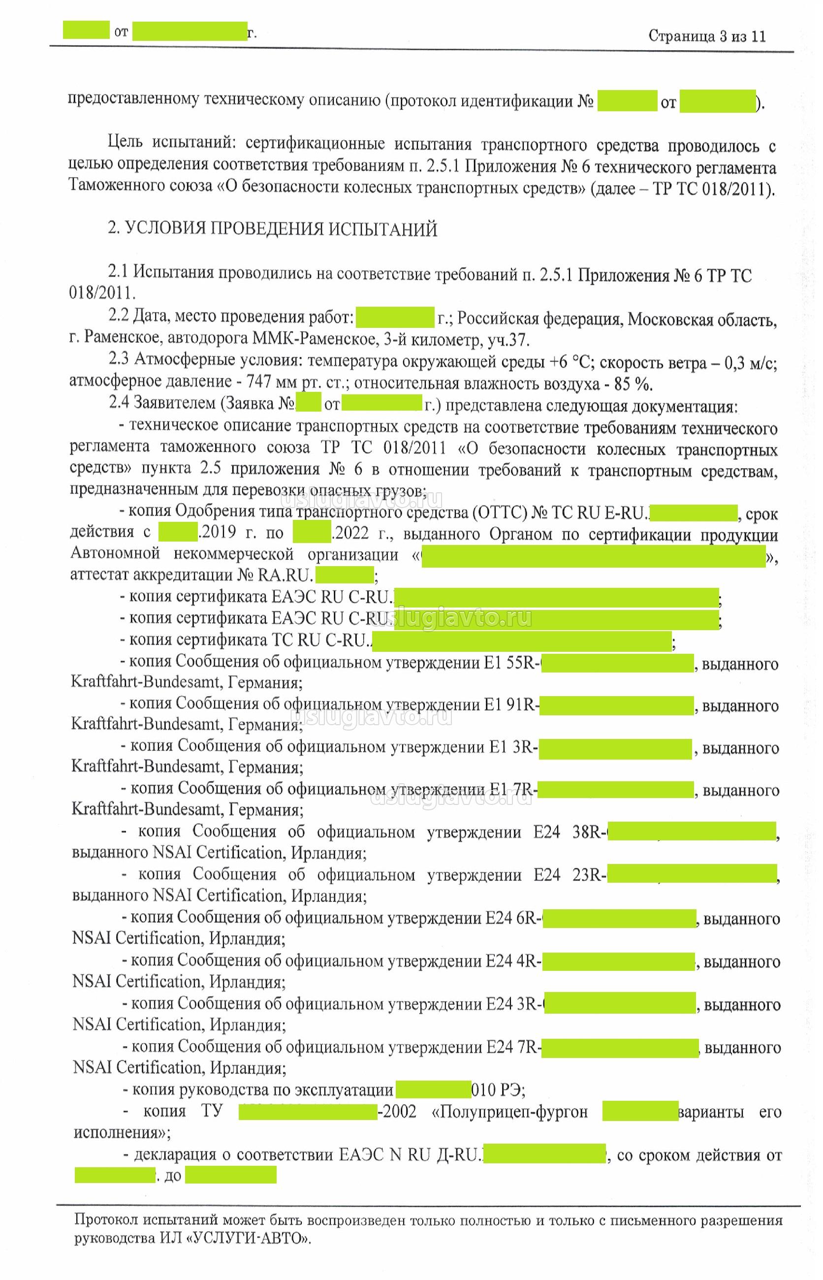 ПРОТОКОЛ сертификационных испытаний транспортного средства (полуприцеп фургон категории О4) для перевозки опасных грузов категории EX/III в соответствии с классификацией ДОПОГ в отношении требований технического регламента Таможенного союза «О безопасности колесных транспортных средств» ТР ТС 018/2011 (подпункт 2.5.1 Приложения № 6 - Правила ООН №105-04 «ЕДИНООБРАЗНЫЕ ПРЕДПИСАНИЯ, КАСАЮЩИЕСЯ ОФИЦИАЛЬНОГО УТВЕРЖДЕНИЯ ТРАНСПОРТНЫХ СРЕДСТВ, ПРЕДНАЗНАЧЕННЫХ ДЛЯ ПЕРЕВОЗКИ ОПАСНЫХ ГРУЗОВ, В ОТНОШЕНИИ ИХ КОНСТРУКТИВНЫХ ОСОБЕННОСТЕЙ»)
