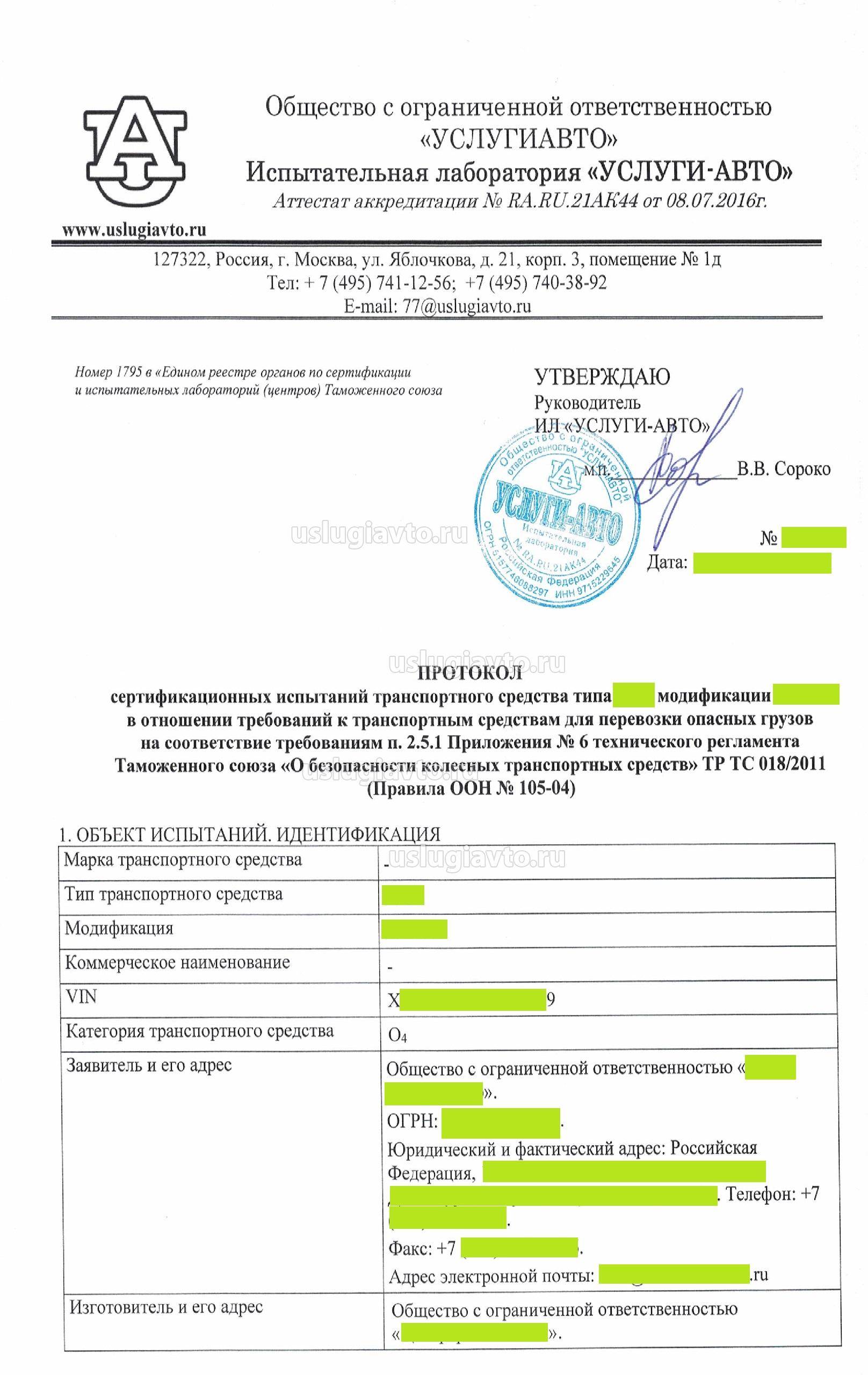 Пример 1:ПРОТОКОЛ сертификационных испытаний транспортного средства (полуприцеп бортовой тентованный категории О4) для перевозки опасных грузов категории