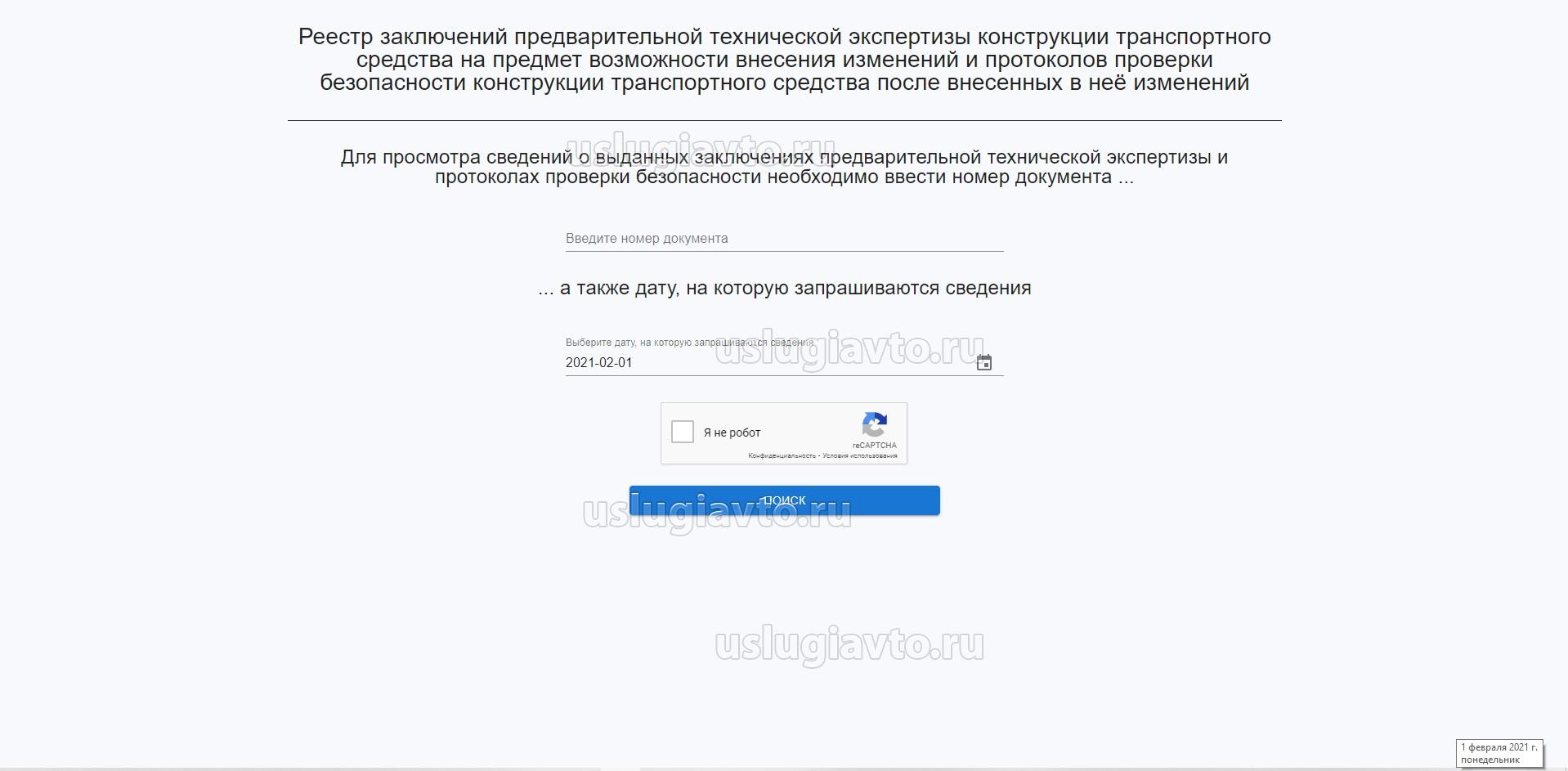 Об информации, предоставляемой сервисом. Проверка осуществляется без привязки к конкретному лицу. Запрос данных происходит по номеру документа и указанию даты, на которую запрашиваются сведения. В результатах запроса выводится основная информация о заключениях предварительной технической экспертизы и протоколов проверки безопасности, выданных уполномоченной организацией собственнику ТС или его представителю.