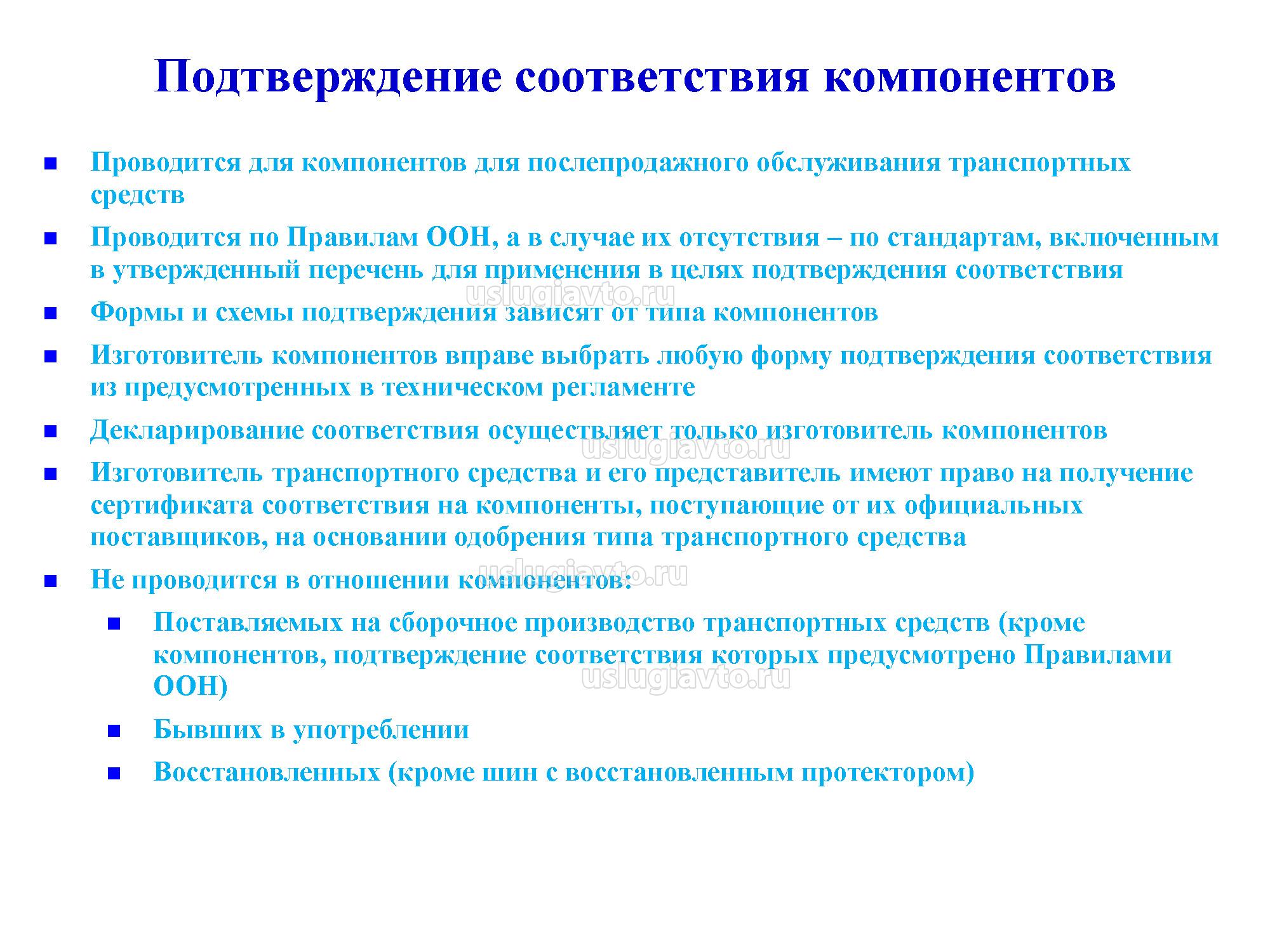 Подтверждение соответствия проводится аккредитованными органами по сертификации, включенными в Единый реестр органов по сертификации и испытательных лабораторий (центров) Таможенного союза, в отношении компонентов, поставляемых как сменные (запасные) части для находящихся в эксплуатации транспортных средств.