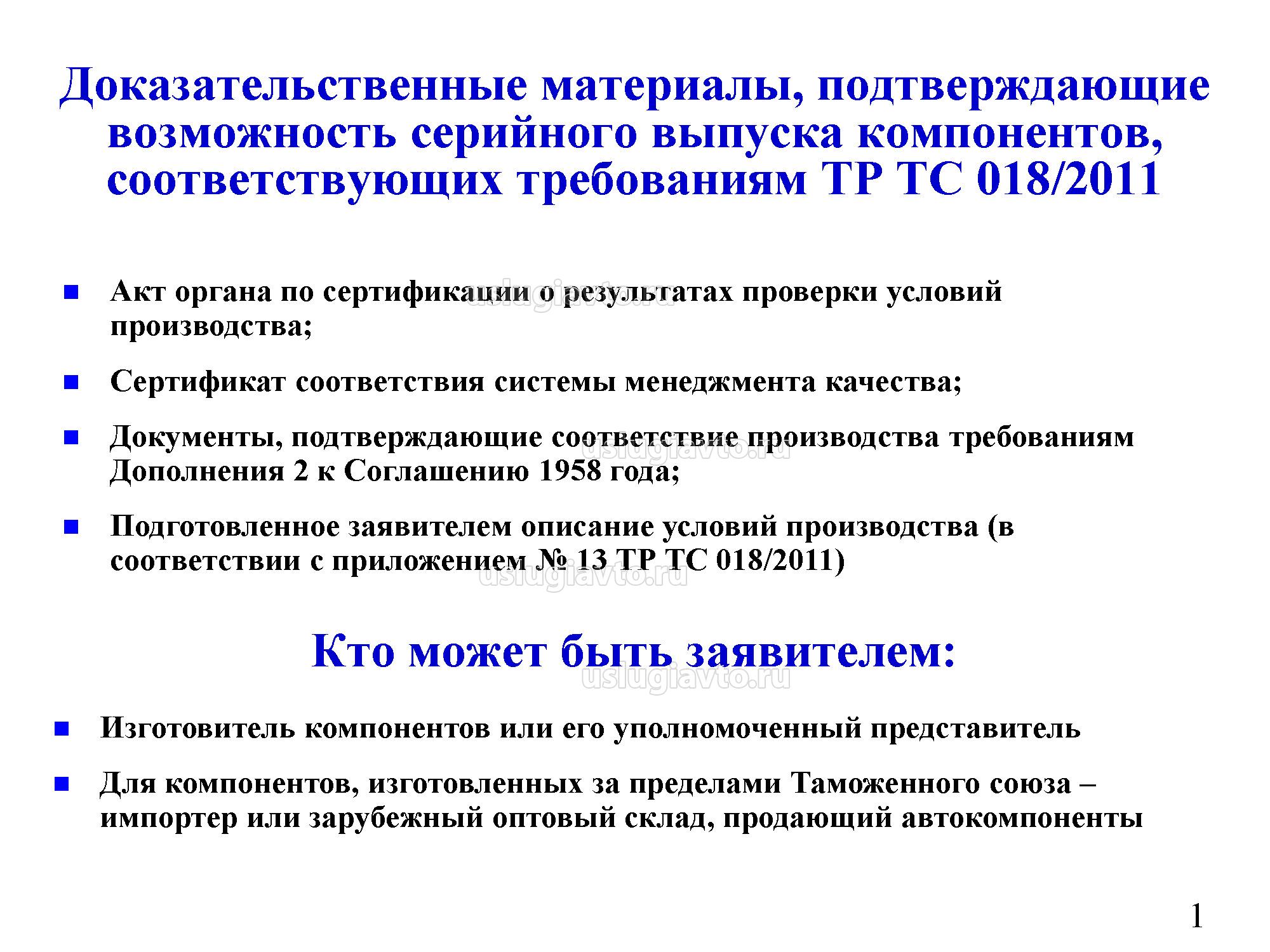 Доказательственные материалы, подтверждающие возможность серийного выпуска компонентов, соответствующих требованиям ТР ТС 018/2011