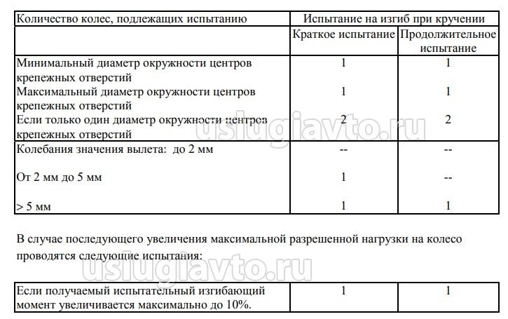 4. Программа испытания для серии типов колес Колеса одного и того же типа (пункт 2.2), но с различными значениями вылета могут группироваться для проведения испытаний с использованием наивысшего значения испытательного изгибающего момента в соответствии с программой испытаний, указанной ниже. В испытание включаются модели колес с более крупным центральным отверстием. В случае получения неудовлетворительного результата испытанию подвергаются дополнительные образцы.