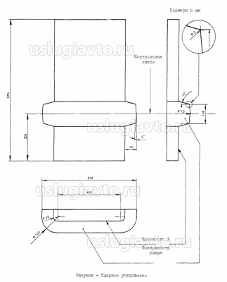 b) точка первого соприкосновения должна быть расположена в средней вертикальной плоскости ударного элемента (допустимое отклонение 425 мм),