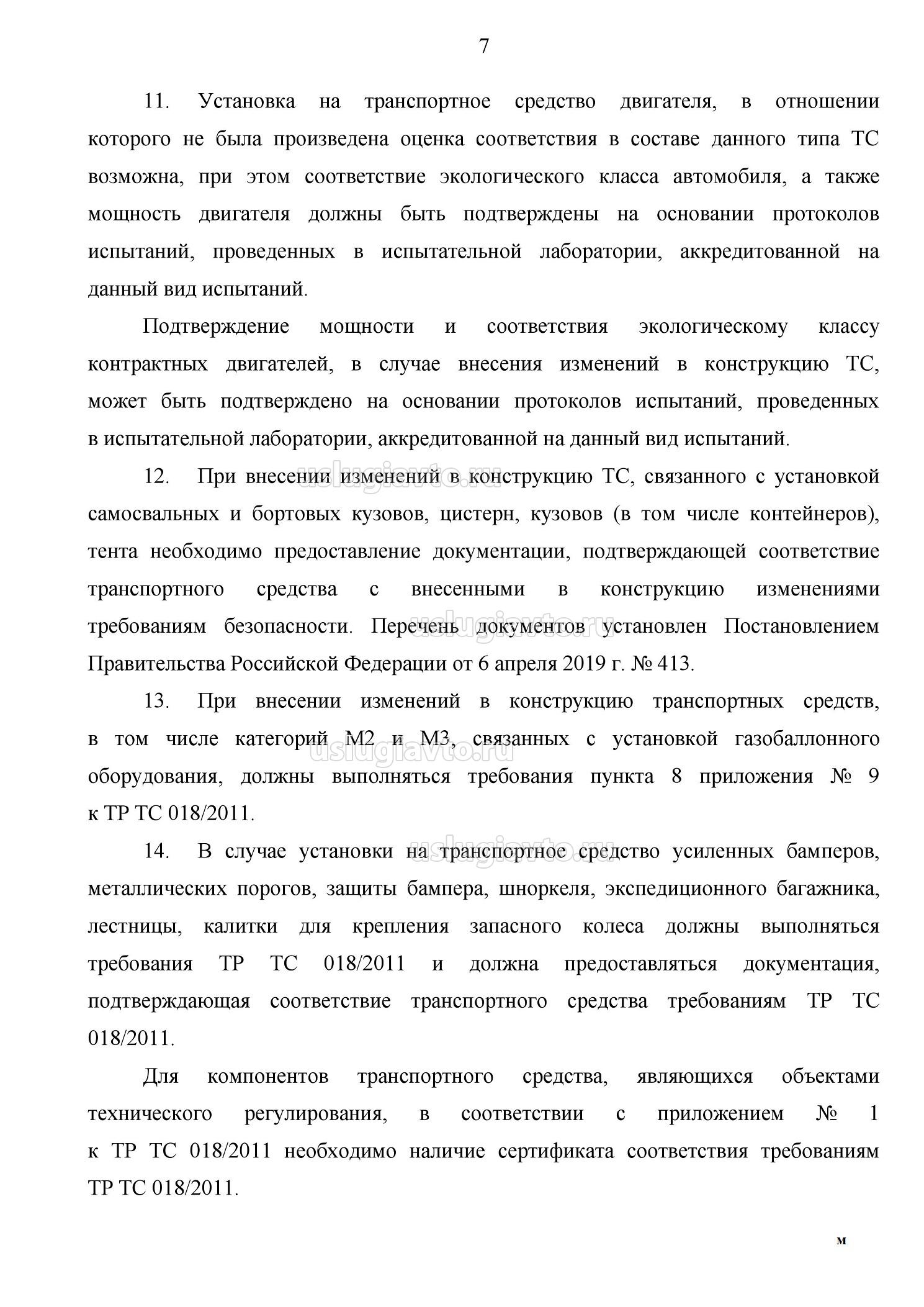 11. Установка на транспортное средство двигателя, в отношении которого не была произведена оценка соответствия в составе данного типа ТС возможна, при этом соответствие экологического класса автомобиля, а также мощность двигателя должны быть подтверждены на основании протоколов испытаний, проведенных в испытательной лаборатории, аккредитованной на данный вид испытаний.