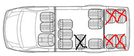 Здравствуйте.Почитал форум, и не до конца понял интересующие меня вопросы. Есть Газель 322132(см картинку) хочу убрать четыре задних сидения(перечёркнуты красным и одиночное боковое(перечёркнуто чёрным). За задним рядом сидений установить перегородку(чёрная полоса)все окна, которые сзади перегородки закрыть решёткой.
