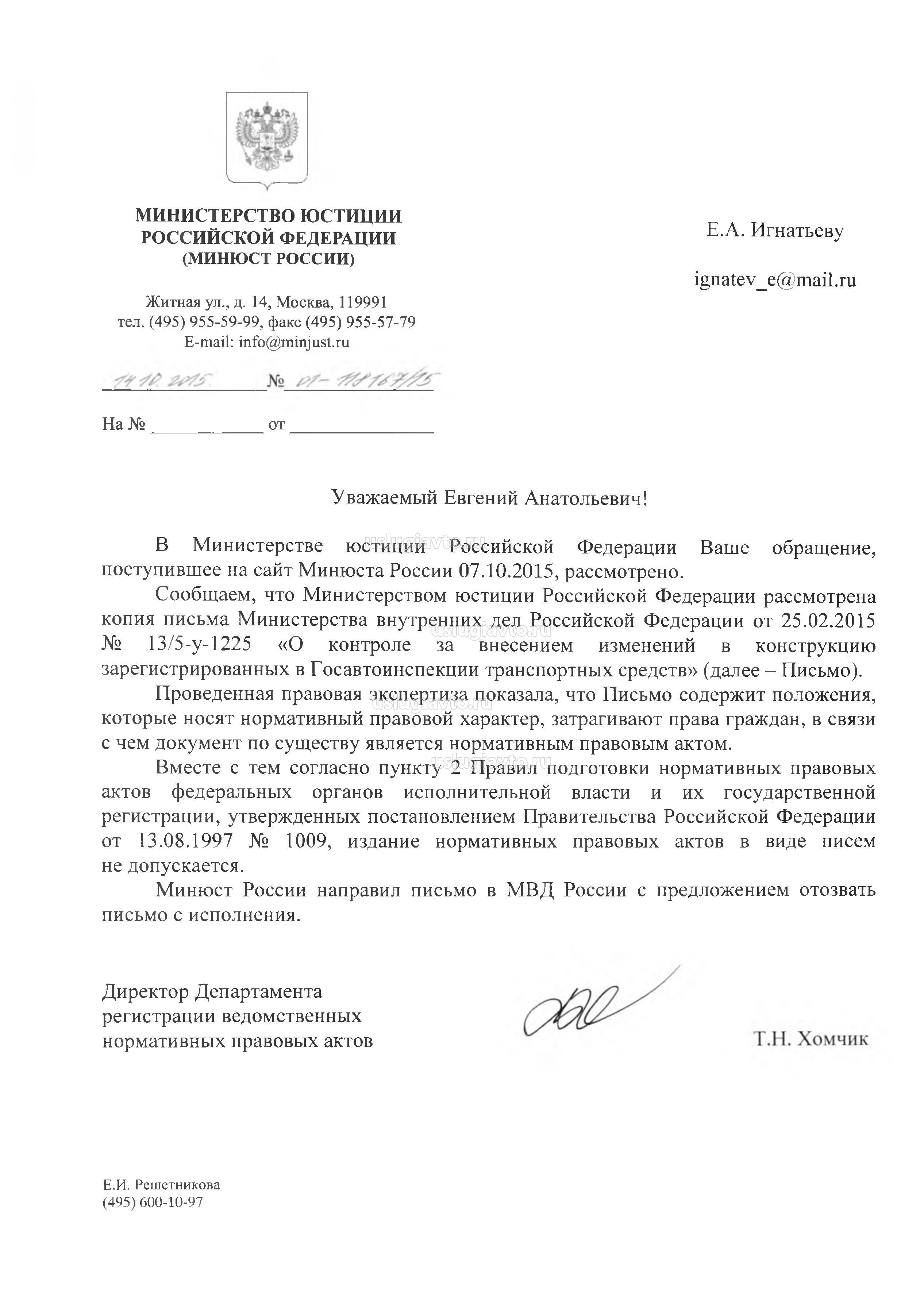 EvgenyIg писал(а):Письмо МВД от 25.02.2015 г. № 13/5-у-1225 "О контроле за внесением изменений в конструкцию зарегистрированных в Госавтоинспекции транспортных средств" не имеет юридической силы нормативно-правового акта, поскольку, в нарушение Конституции РФ, не было официально опубликовано и издано в форме, не предусмотренной для таких актов. Вот подтверждение.
