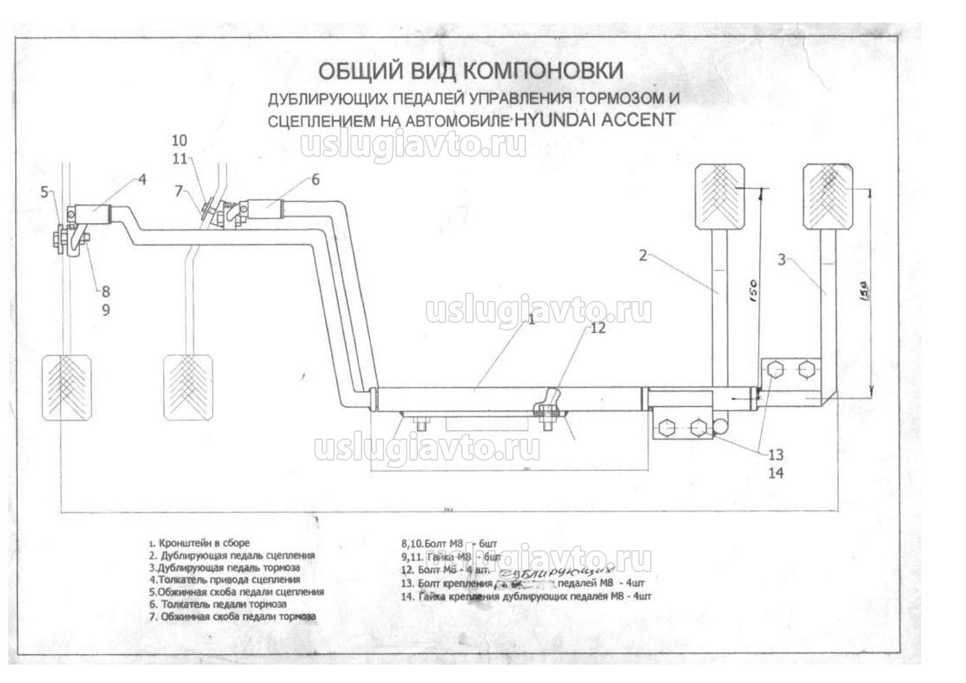 Описание производимых работ: Рядом с местом водителя-ученика оборудуется рабочее место инструктора с дублирующими педалями управления тормозной системой и сцеплением (МКПП). Дублирующие педали управления выполняются в соответствии с требованиями Правил ЕЭК ООН № 35. При переоборудовании должны быть использованы механические приводы стандартной конструкции гарантированной прочности. Конструкция дополнительного привода и расположение дублирующих педалей не должны препятствовать функционированию рабочей тормозной системы автомобиля и приводу сцепления.