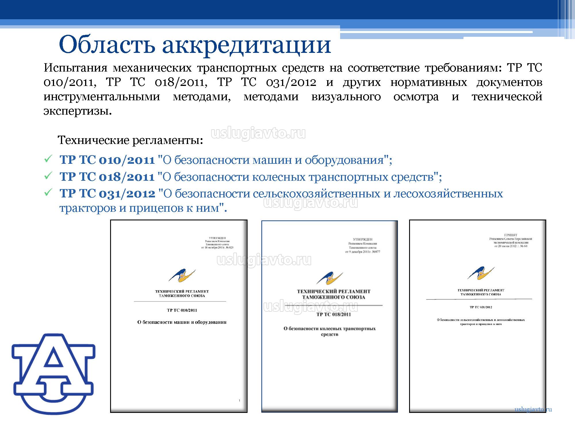 ИЛ «УСЛУГИ-АВТО» осуществляет деятельность по подтверждению соответствия продукции Техническим регламентам Таможенного Союза (ТР ТС) согласно действующей на момент оформления документов по оценке соответствия (испытаниям) области аккредитации RA.RU.21АК44.