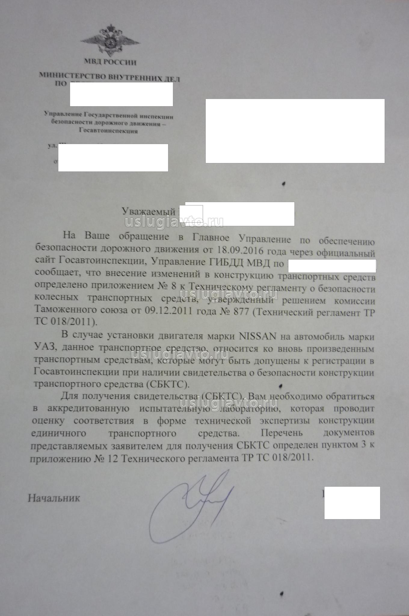 Отказ написан с грубейшим нарушением требований технического регламента 018/2011. Собственник автомобиля, который находится в эксплуатации не обязан получать СБКТС в случае внесения изменений в его конструкцию, а конкретное подразделение ГИБДД обязывает его это сделать - это первое! Второе- это невозможность его получения по причине не выполнения ряда современных требований безопасности конструкции ТС, например отсутствия ЭРА ГЛОНАСС, двигатель не соответствует 4-ому экологического классу, отсутствие системы АБС и т.п. Третье - собственник не обязан уплачивать утилизационный сбор, если планирует заменить один компонент ТС на другой. Так можно и требовать получать СБКТС при замене лампы Hella на Philips, которые не предусмотрены конструкцией конкретного транспортного средства.