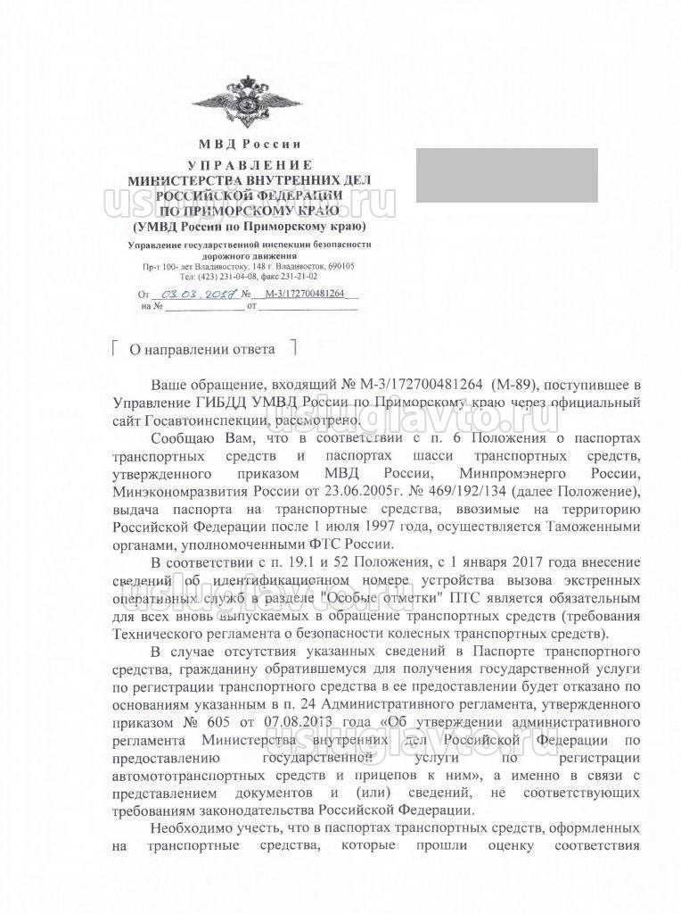 В случае отсутствия указанных сведений в Паспорте транспортного средства, гражданину обратившемуся для получения государственной услуги но регистрации транспортного средства в ее предоставлении будет отказано по основаниям указанным в п. 24 Административного регламента, утвержденного приказом № 605 от 07.08.2013 года «Об утверждении административного регламента Министерства внутренних дел Российской Федерации по предоставлению государственной услуги по регистрации автомототранспортных средств и прицепов к ним», а именно в связи с представлением документов и (или) сведений, не соответствующих требованиям законодательства Российской Федерации.