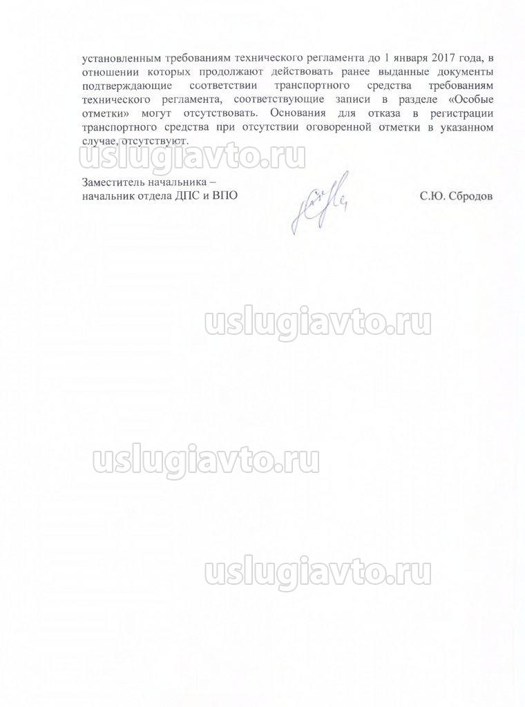 Необходимо учесть, что в паспортах транспортных средств, оформленных на транспортные средства, которые прошли оценку соответствия установленным требованиям технического регламента до 1 января 2017 года, в отношении которых продолжают действовать ранее выданные документы, подтверждающие соответствии транспортною средства требованиям технического регламента, соответствующие записи в разделе «Особые отметки» могут отсутствовать. Основания для отказа в регистрации транспортного средства при отсутствии оговоренной отметки в указанном случае, отсутствуют.