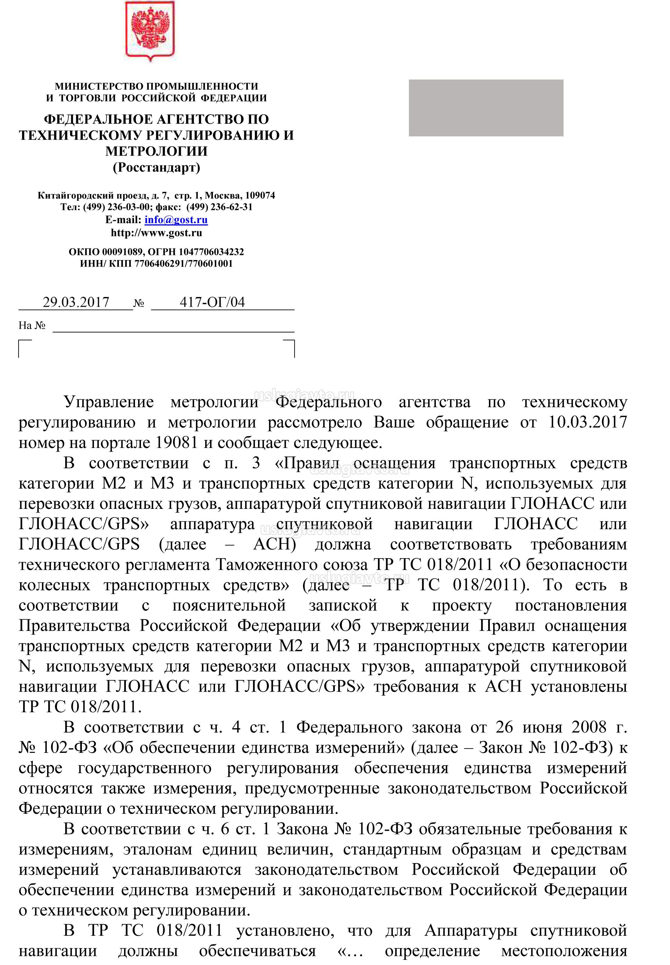 В соответствии с п. 3 «Правил оснащения транспортных средств категории М2 и М3 и транспортных средств категории N, используемых для перевозки опасных грузов, аппаратурой спутниковой навигации ГЛОНАСС или ГЛОНАСС/GPS» аппаратура спутниковой навигации ГЛОНАСС или ГЛОНАСС/GPS (далее – АСН) должна соответствовать требованиям технического регламента Таможенного союза ТР ТС 018/2011 «О безопасности колесных транспортных средств» (далее – ТР ТС 018/2011). То есть в соответствии с пояснительной запиской к проекту постановления Правительства Российской Федерации «Об утверждении Правил оснащения транспортных средств категории М2 и М3 и транспортных средств категории N, используемых для перевозки опасных грузов, аппаратурой спутниковой навигации ГЛОНАСС или ГЛОНАСС/GPS» требования к АСН установлены ТР ТС 018/2011. В соответствии с ч. 4 ст. 1 Федерального закона от 26 июня 2008 г. № 102-ФЗ «Об обеспечении единства измерений» (далее – Закон № 102-ФЗ) к сфере государственного регулирования обеспечения единства измерений относятся также измерения, предусмотренные законодательством Российской Федерации о техническом регулировании. В соответствии с ч. 6 ст. 1 Закона № 102-ФЗ обязательные требования к измерениям, эталонам единиц величин, стандартным образцам и средствам измерений устанавливаются законодательством Российской Федерации об обеспечении единства измерений и законодательством Российской Федерации о техническом регулировании. В ТР ТС 018/2011 установлено, что для Аппаратуры спутниковой навигации должны обеспечиваться «… определение местоположения транспортного средства с погрешностью не более 15 м по координатным осям и скорости транспортного средства с погрешностью не более 0,1 м/с при доверительной вероятности 0,95 …» Таким образом в ТР ТС 018/2011 установлены требования к погрешности определения местоположения и скорости транспортного средства. Поскольку определение местоположения и скорости транспортного средства является измерением, то в ТР ТС 018/2011 установлены требования к погрешности измерений. В соответствии с Федеральным законом от 27декабря 2002 г. № 184-ФЗ
