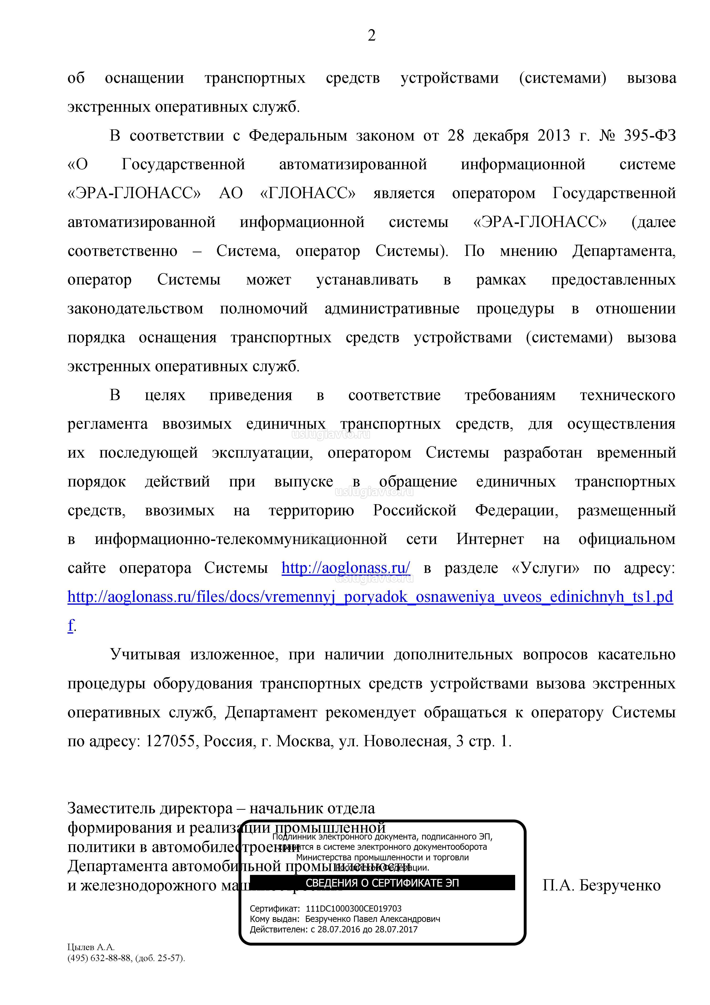 Департамент автомобильной промышленности и железнодорожного машиностроения Министерства промышленности и торговли Российской Федерации (далее - Департамент) рассмотрел в рамках своей компетенции Ваше обращение от ХХ апреля 2017 г. №ХХ, и сообщает следующее. Техническим регламентом Таможенного союза «О безопасности колесных транспортных средств» (ТР ТС 018/2011), утвержденным решением Комиссии Таможенного союза от 09 декабря 2011 г. № 877 (далее - технический регламент), установлено определение термина единичное транспортное средство как транспортное средство, в том числе, ввозимое единую таможенную территорию Таможенного союза физическим лицом для собственных нужд или ранее участвовавшее в дорожном движении в государствах, не являющихся членами Таможенного союза, при условии, что с момента изготовления транспортного средства прошло более трех лет. При импорте единичного транспортного средства на единую территорию Евразийского экономического союза, такое транспортное средство, при прохождении процедуры оценки соответствия, должно соответствовать требованиям технического регламента, установленным на момент прохождения процедуры оценки соответствия, в том числе с 01 января 2017 г. - требованиям об оснащении транспортных средств устройствами (системами) вызова экстренных оперативных служб. В соответствии с Федеральным законом от 28 декабря 2013 г. № 395-ФЗ «О Государственной автоматизированной информационной системе «ЭРА-ГЛОНАСС» АО «ГЛОНАСС» является оператором Государственной автоматизированной информационной системы «ЭРА-ГЛОНАСС» (далее соответственно - Система, оператор Системы). По мнению Департамента, оператор Системы может устанавливать в рамках предоставленных законодательством полномочий административные процедуры в отношении порядка оснащения транспортных средств устройствами (системами) вызова экстренных оперативных служб. В целях приведения в соответствие требованиям технического регламента ввозимых единичных транспортных средств, для осуществления их последующей эксплуатации, оператором Системы разработан временный порядок действий при выпуске в обращение единичных транспортных средств, ввозимых на территорию Российской Федерации, размещенный в информационно-телекоммуникационной сети Интернет на официальном сайте оператора Системы http://aoglonass.ru/ в разделе «Услуги» по адресу: http://aoglonass.ru/files/docs/vremennyi porvadok osnaweniva uveos edinichnyh tsl.pdf. Учитывая изложенное, при наличии дополнительных вопросов касательно процедуры оборудования транспортных средств устройствами вызова экстренных оперативных служб, Департамент рекомендует обращаться к оператору Системы по адресу: 127055, Россия, г. Москва, ул. Новолесная, 3 стр. 1.