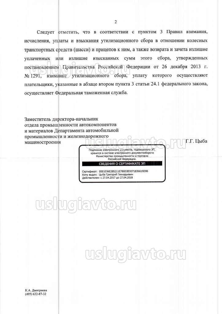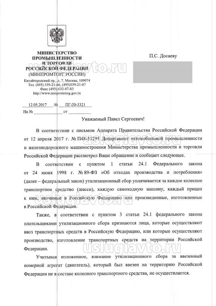 В соответствии с письмом Аппарата Правительства Российской Федерации от 12 апреля 2017 г. № П48-51295 Департамент автомобильной промышленности и железнодорожного машиностроения Министерства промышленности и торговли Российской Федерации рассмотрел Ваше обращение и сообщает следующее. В соответствии с пунктом 1 статьи 24.1 Федерального закона от 24 июня 1998 г. № 89-ФЗ «Об отходах производства и потребления» (далее - федеральный закон) утилизационный сбор уплачивается за каждое колесное транспортное средство (шасси), каждую самоходную машину, каждый прицеп к ним, ввозимые в Российскую Федерацию или произведенные, изготовленные в Российской Федерации. Также, в соответствии с пунктом 3 статьи 24.1 федерального закона плательщиками утилизационного сбора признаются лица, которые осуществляют ввоз транспортах средств в Российскую Федерацию, или которые осуществляют производство, изготовление транспортных средств на территории Российской Федерации. Учитывая изложенное, взимание утилизационного сбора за ввезенный номерной агрегат (двигатель), который был ввезен на территорию Российской Федерации не в составе колесного транспортного средства, не осуществляется. Следует отметить, что в соответствии с пунктом 3 Правил взимания, исчисления, уплаты и взыскания утилизационного сбора в отношении колесных транспортных средств (шасси) и прицепов к ним, а также возврата и зачета излишне уплаченных и ж излишне взысканных сумм этого сбора, утвержденных постановлением Правительства Российской Федерации от 26 декабря 2013 г. № 1291, взимание утилизационного сбора, уплату которого осуществляют плательщики, указанные в абзаце втором пункта 3 статьи 24.1 федерального закона, осуществляет Федеральная таможенная служба.