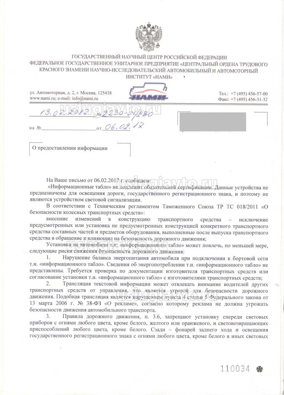 «Информационные табло» не подлежит обязательной сертификации. Данные устройства не предназначены для освещения дороги, государственного регистрационного знака, и поэтому не являются устройством световой сигнализации. В соответствии с Техническим регламентом Таможенного Союза ТР ТС 018/2011 «О безопасности колесных транспортных средств»: внесение изменений в конструкцию транспортного средства - исключение предусмотренных или установка не предусмотренных конструкцией конкретного транспортного средства составных частей и предметов оборудования, выполненные после выпуска транспортного средства в обращение и влияющие на безопасность дорожного движения: Установка на автомобили т.н. «информационного табло» может повлечь, по меньшей мере, следующие риски снижения безопасности дорожного движения: 1. Нарушение баланса энергопитания автомобиля при подключении к бортовой сети т.н. «информационного табло». Сведения об энергопотреблении т.н. «информационного табло» нс представлены. Требуется проверка по документации изготовителя транспортных средств или согласование установки т.н. «информационного табло» с изготовителями транспортных средств: 2. Трансляция текстовой информации может отвлекать внимание водителей других транспортных средств от управления, что является угрозой для безопасности дорожного движения. Подобная трансляция является нарушением пункта 4 статьи 5 Федерального закона от 13 марта 2006 г. № 38-ФЗ «О рекламе», согласно которому реклама не должна угрожать безопасности движения автомобильного транспорта. 3. Правила дорожного движения, п. 3.6, запрещают установку спереди световых приборов с огнями любого цвета, кроме белого, желтого или оранжевого, и световозвращающих приспособлений любого цвета, кроме белого. Сзади - фонарей заднего хода и освещения государственного регистрационного знака с огнями любого цвета, кроме белого и иных световых приборов с огнями любого цвета, кроме красного, желтого или оранжевого, а также световозвращающих приспособлений любого цвета, кроме красного. 4. «Информационное табло» обладая массой, создает знакопеременные инерционные нагрузки на места крепления (крышу, водостоки).