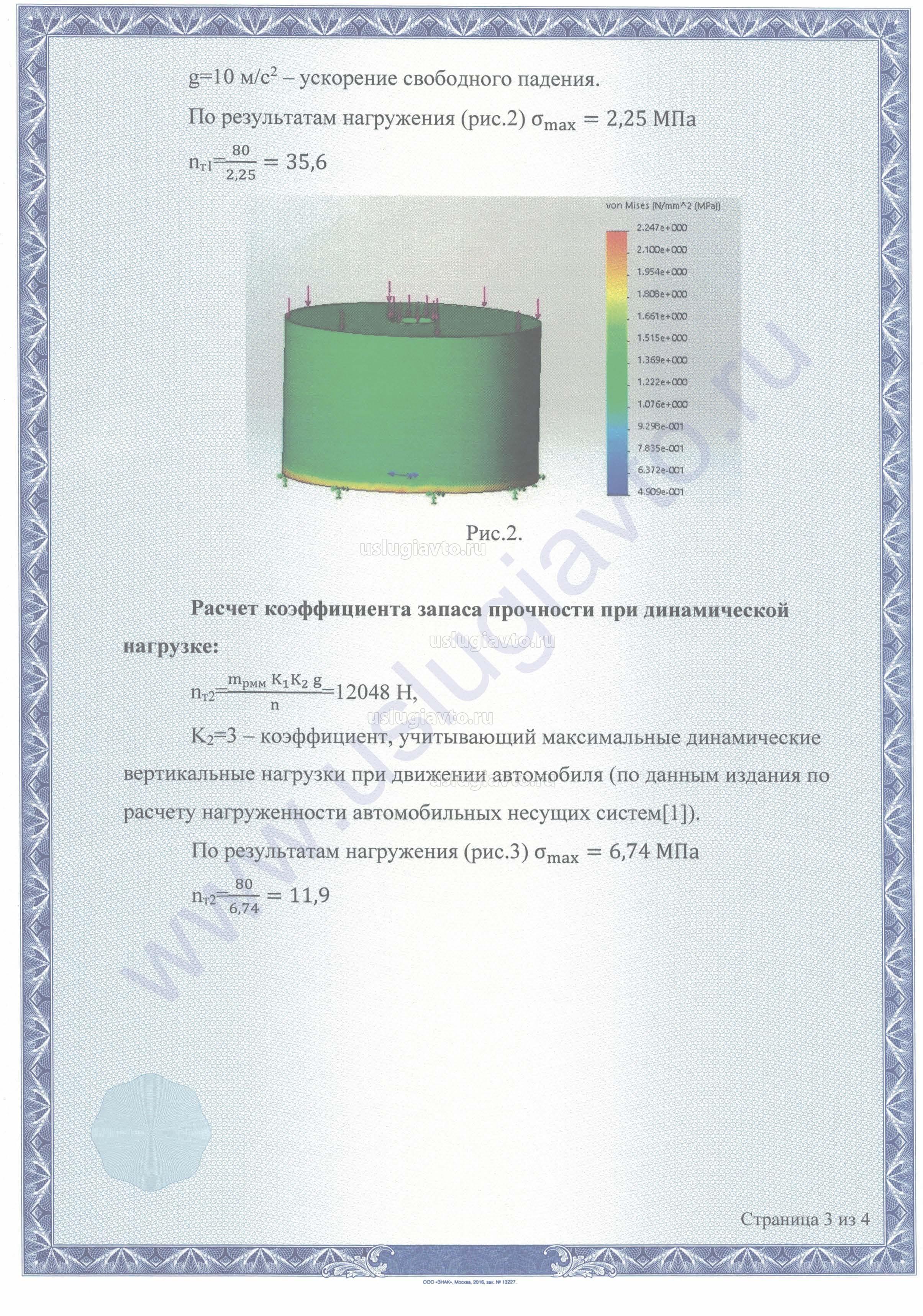 Полученные коэффициенты запаса прочности (35,6 при статической нагрузке и 11,9 при динамической нагрузке) значительно превышают минимальные допустимые значения запаса прочности, принятые в отечественном автомобилестроении (коэффициент запаса прочности по пределу текучести не менее 3, по данным справочника конструктора-машиностроителя[2]).